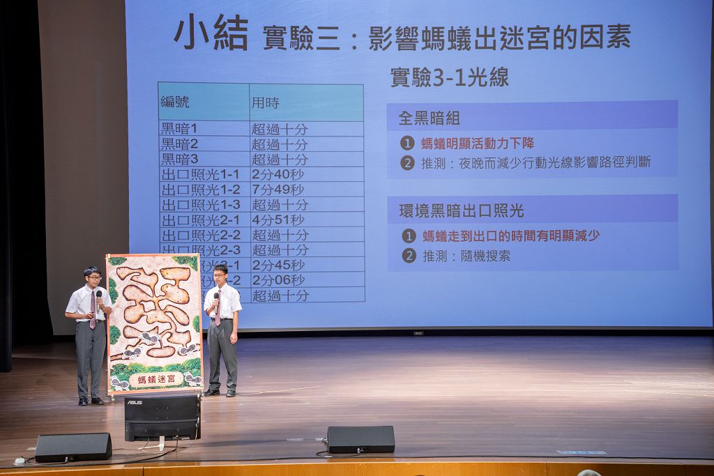 第五組「蟻學千里 — 探討螞蟻的學習及社會行為」,透過精心設計的迷宮實驗,觀察螞蟻的學習能力與群體互動。