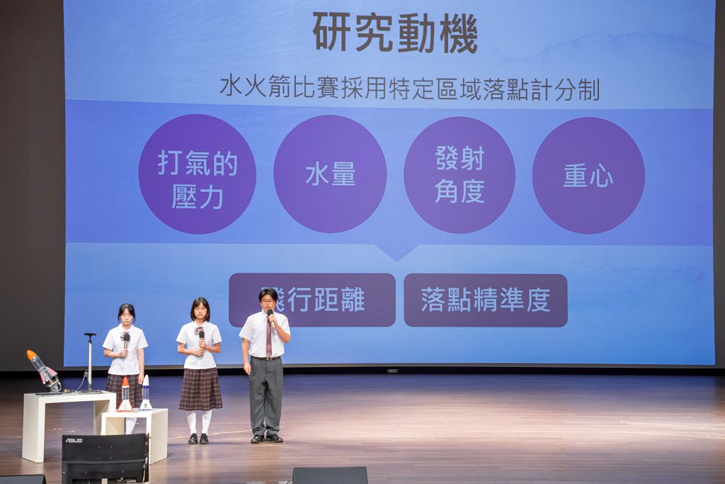 第四組「一箭準心 — 從失誤到命中的水火箭之旅」,藉由控制變因,試出水火箭最佳發射條件,展現嚴謹的科學精神。