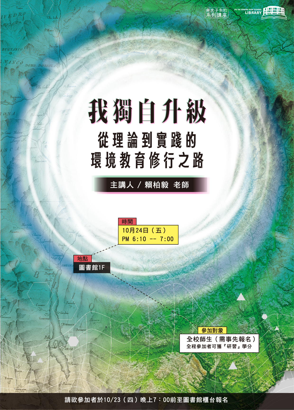 114學年度第一學期圖書館與夫子有約講座第一場--「 我獨自升級 」從理論到實踐的環境教育修行之路