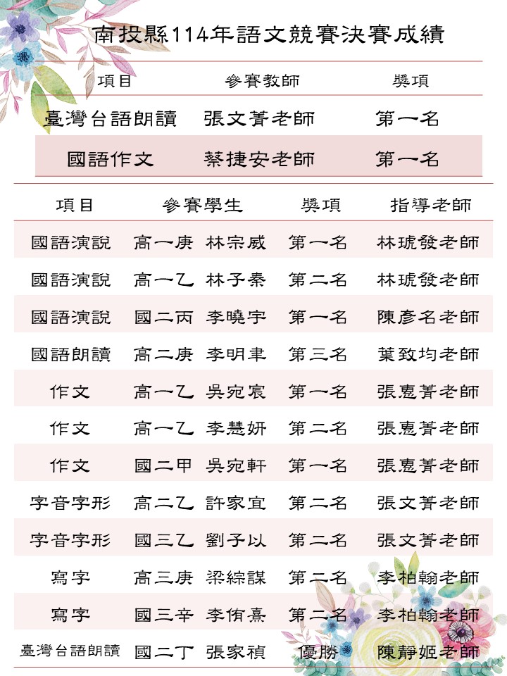 賀!!!恭喜本校師生參加114年南投縣語文競賽榮獲佳績