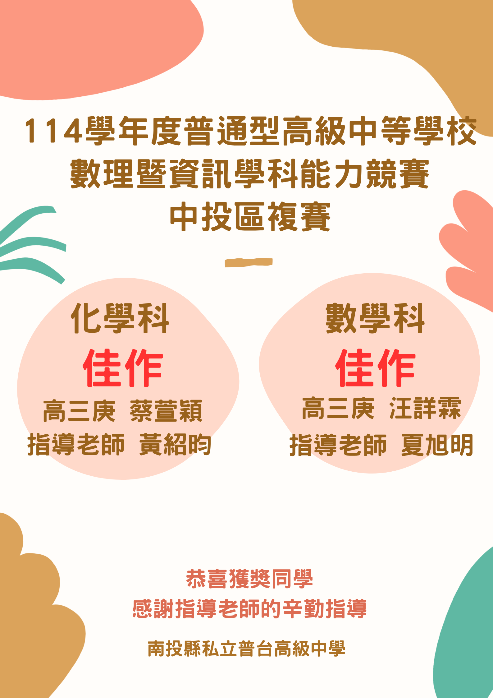 賀!本校學生參加114學年度普通高中數理暨資訊學科能力競賽中投區複賽 榮獲佳績
