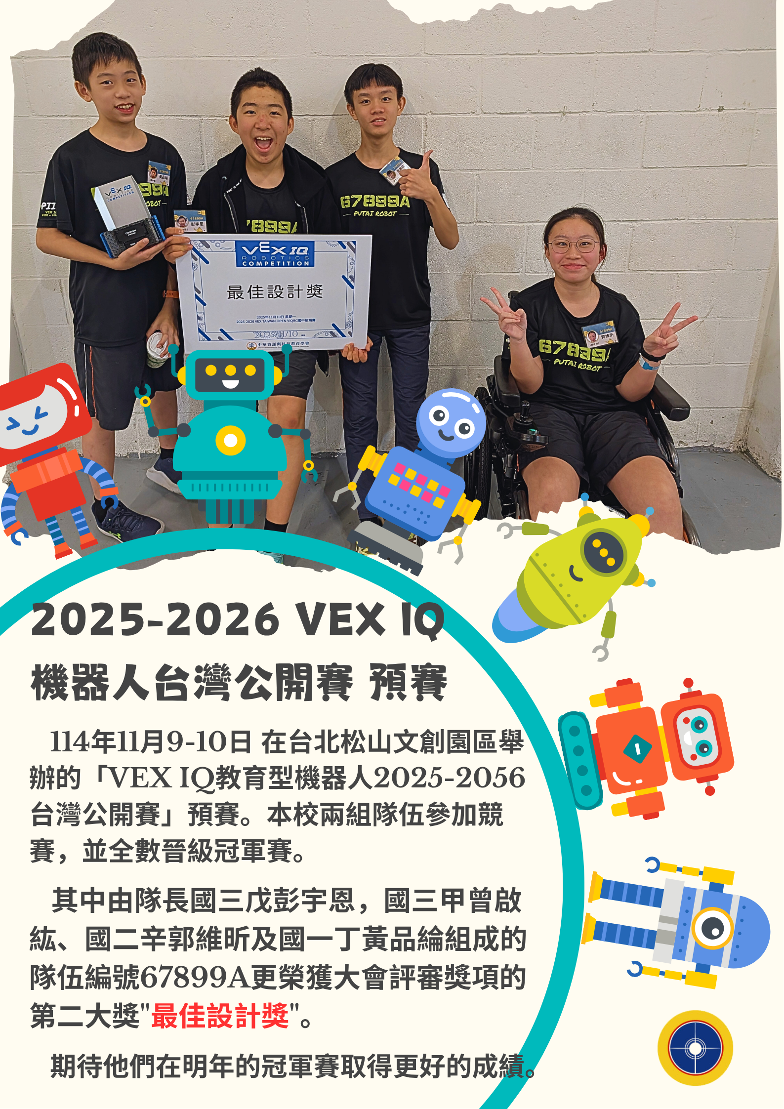 VEX IQ機器人2025-2026台灣公開賽預賽 本校學生榮獲最佳設計獎