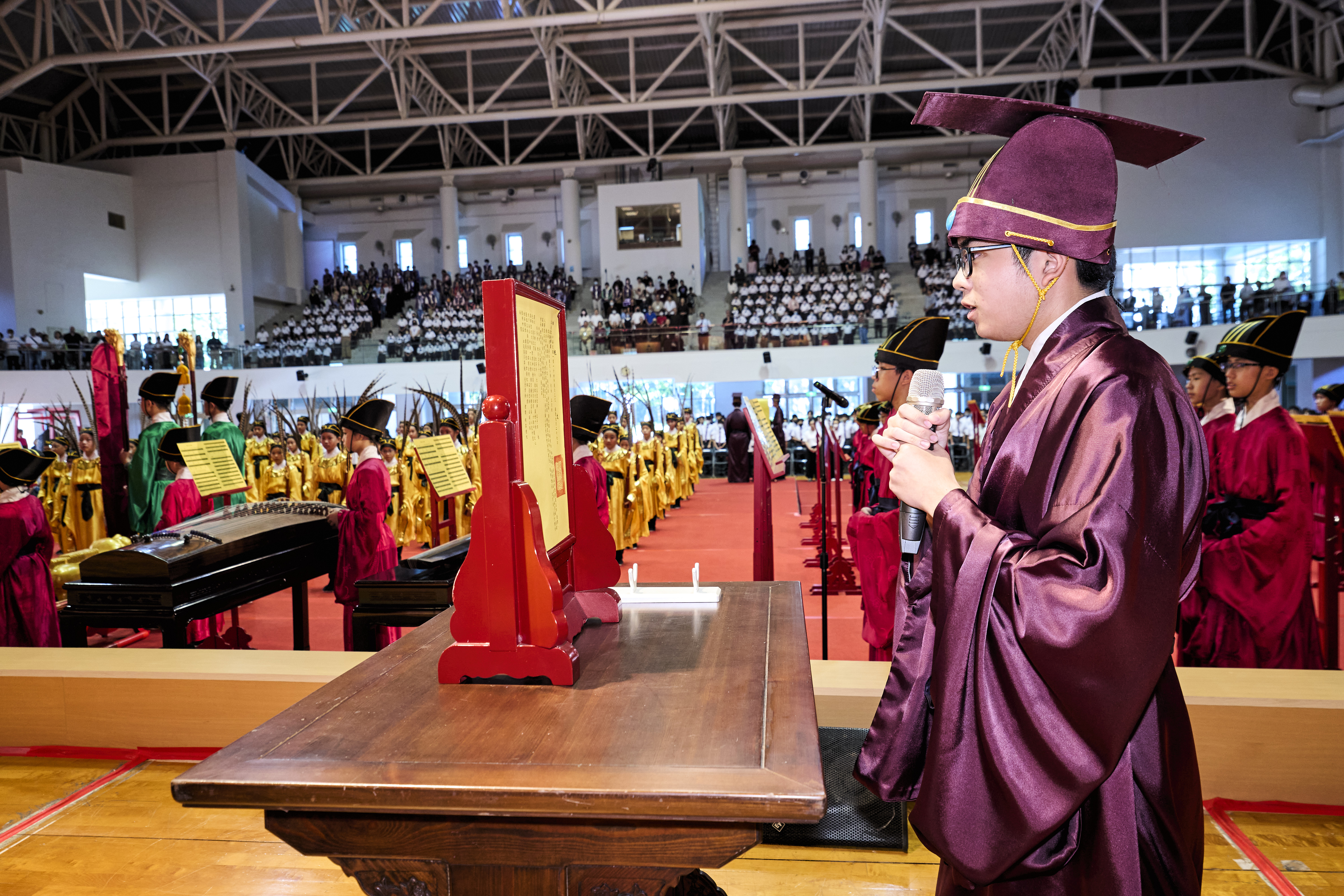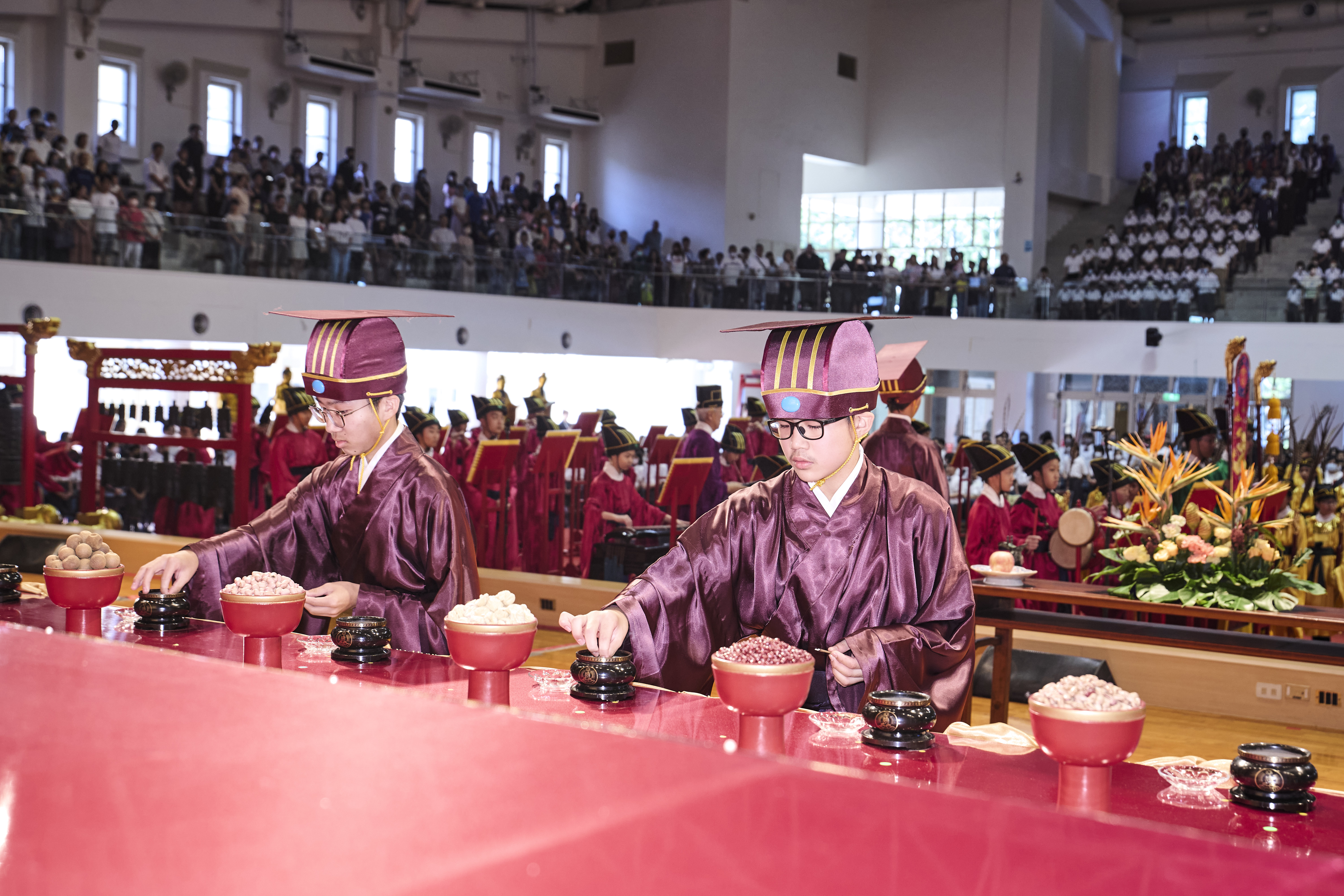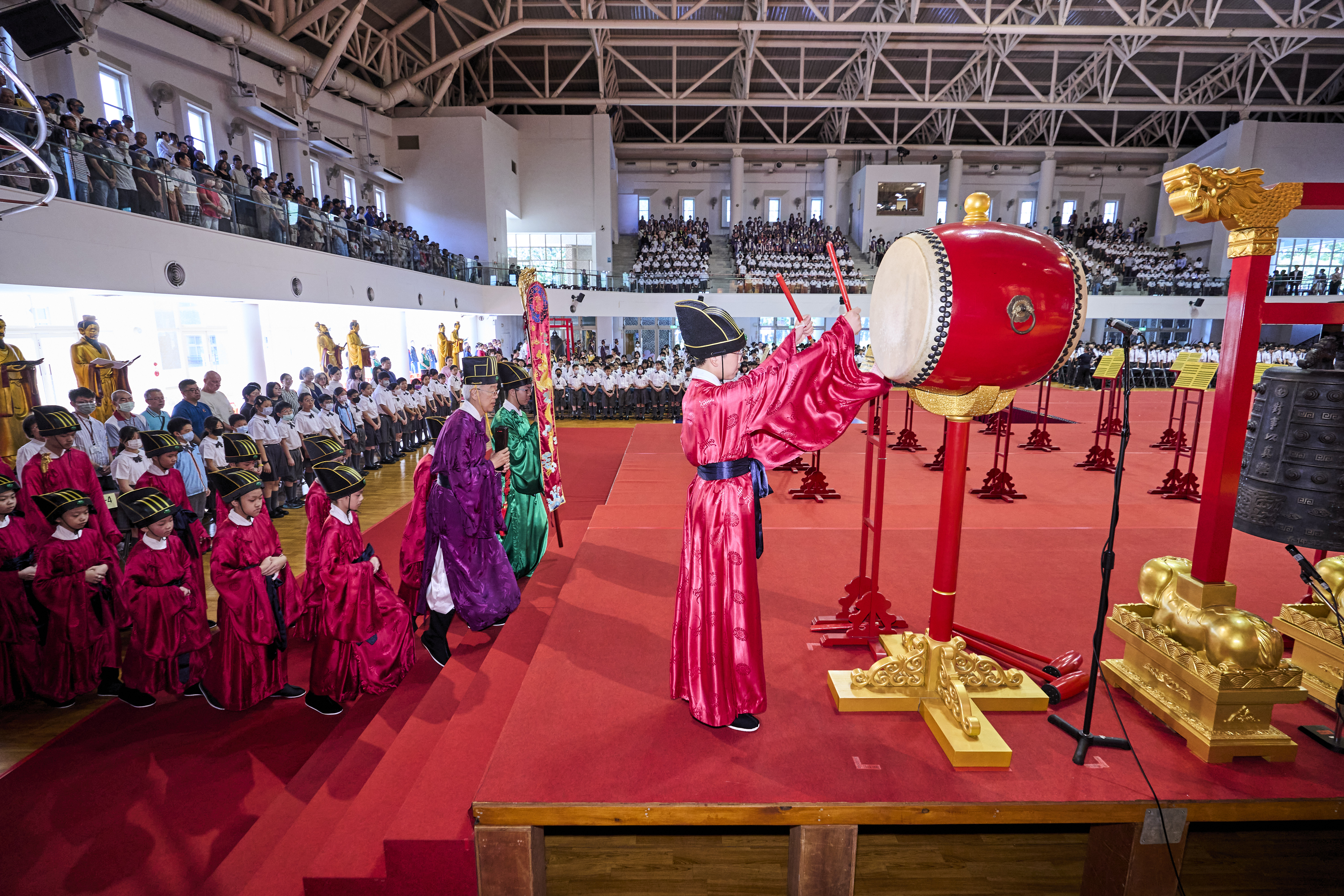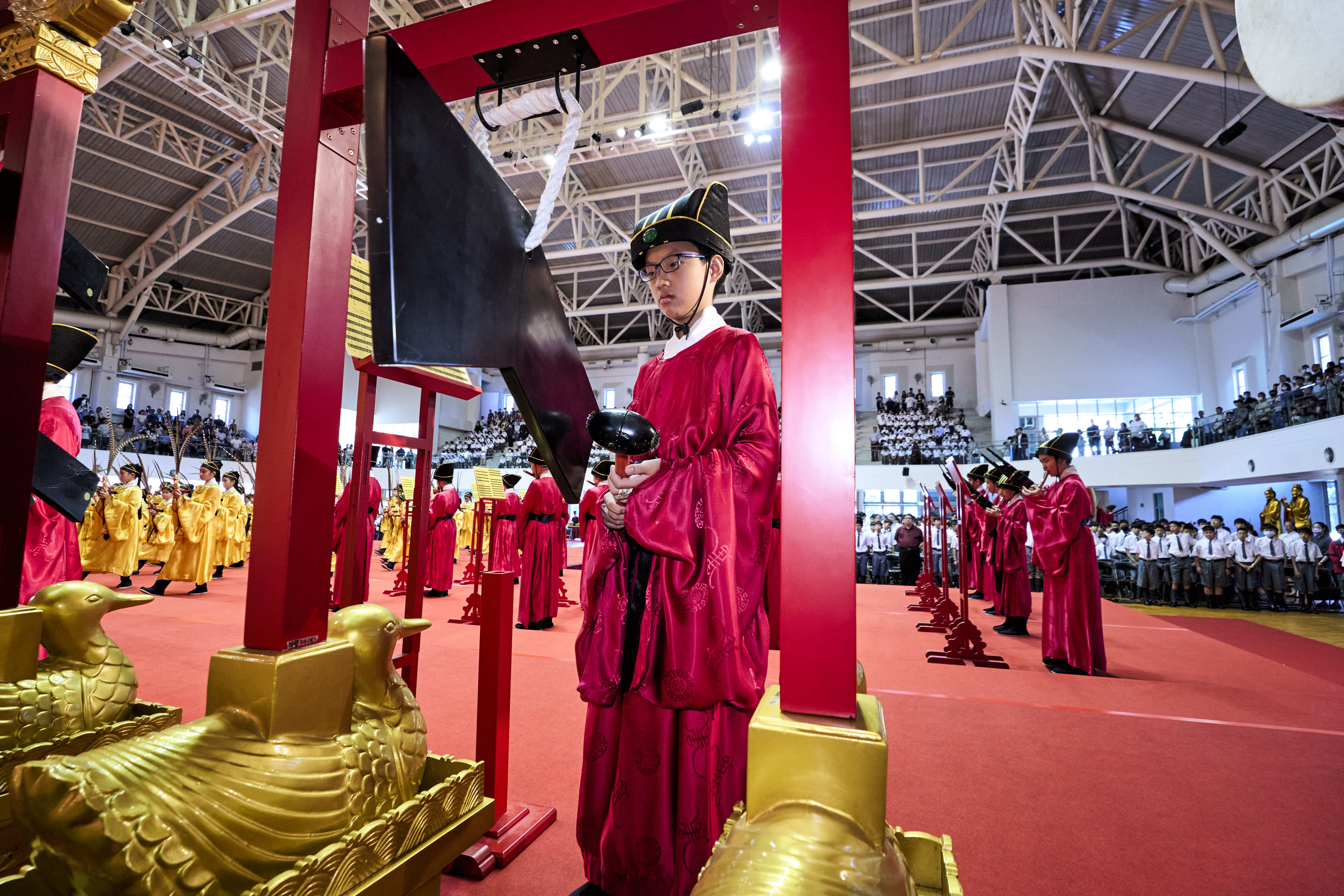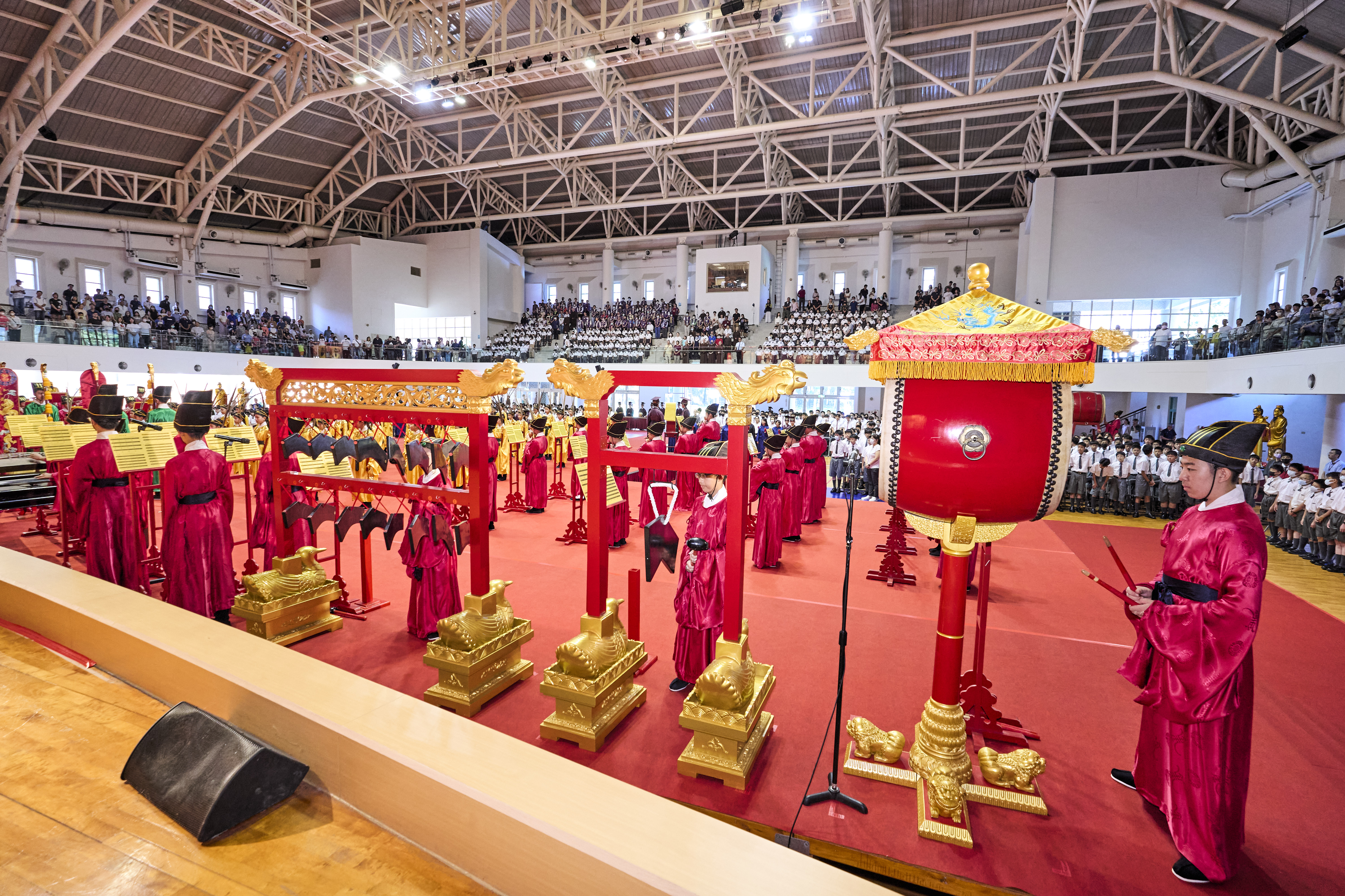 丹墀中央,佾生行列整肅,翟籥交映;禮生舉止合度,莊重恭謹;樂生八音齊奏,古樂《大成樂章》悠然迴盪,攝受人心。三生各司其職,完美合作,莊嚴中蘊含和諧之美。典禮尾聲,全體學子齊向師長行三鞠躬禮,表達謝師之情;隨後,在四年級學生的領誦下,千餘人同聲誦讀《論語》,再合唱〈禮運大同篇〉,鏗鏘誦聲響徹會場。「敬師釋奠典禮」不僅體現了「敬、慈、和、真」的校訓精神,更讓孩子們透過禮樂薰習,涵養尊師重道、謙和恭敬的品德,奠定未來成功人生的基石。