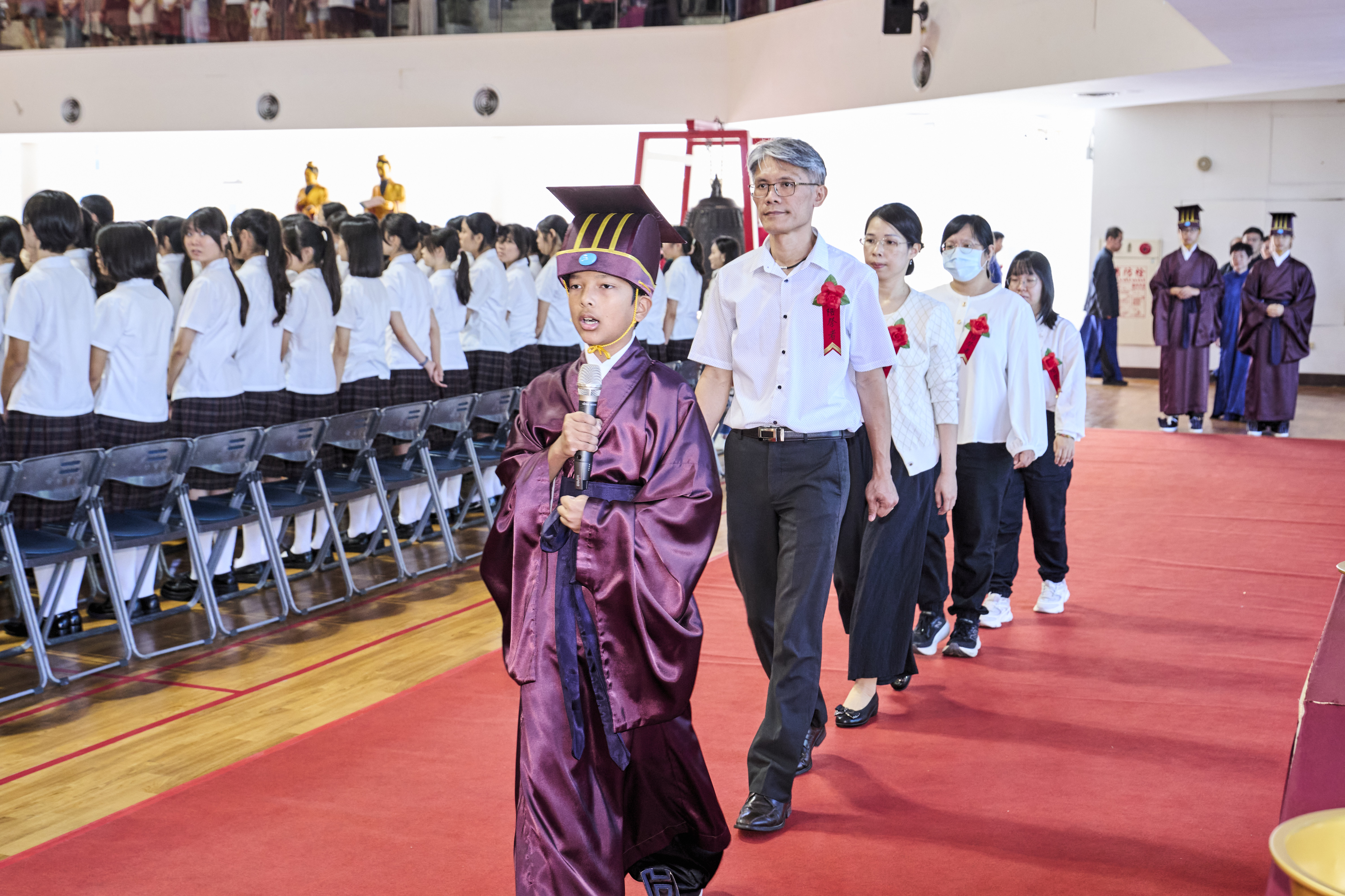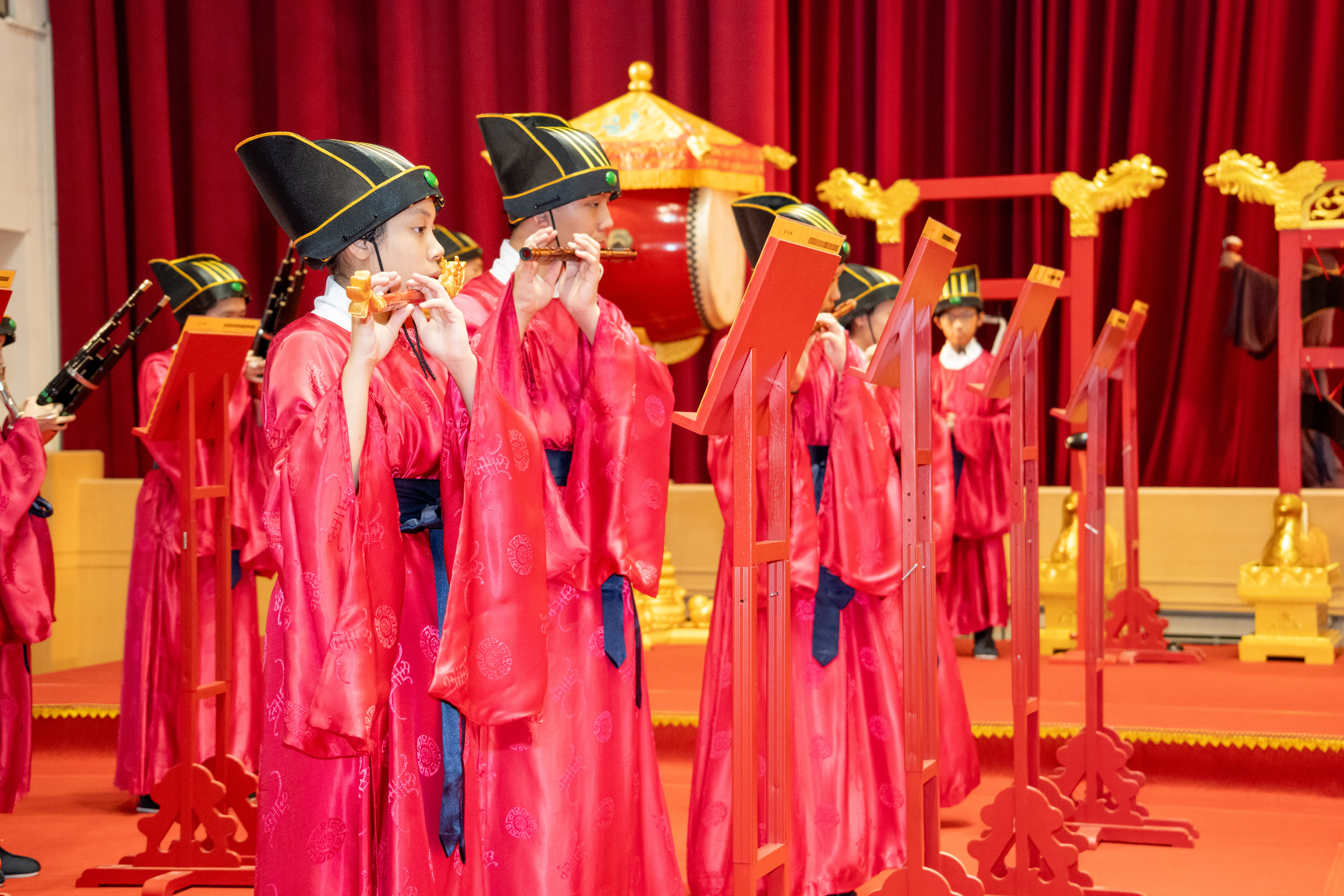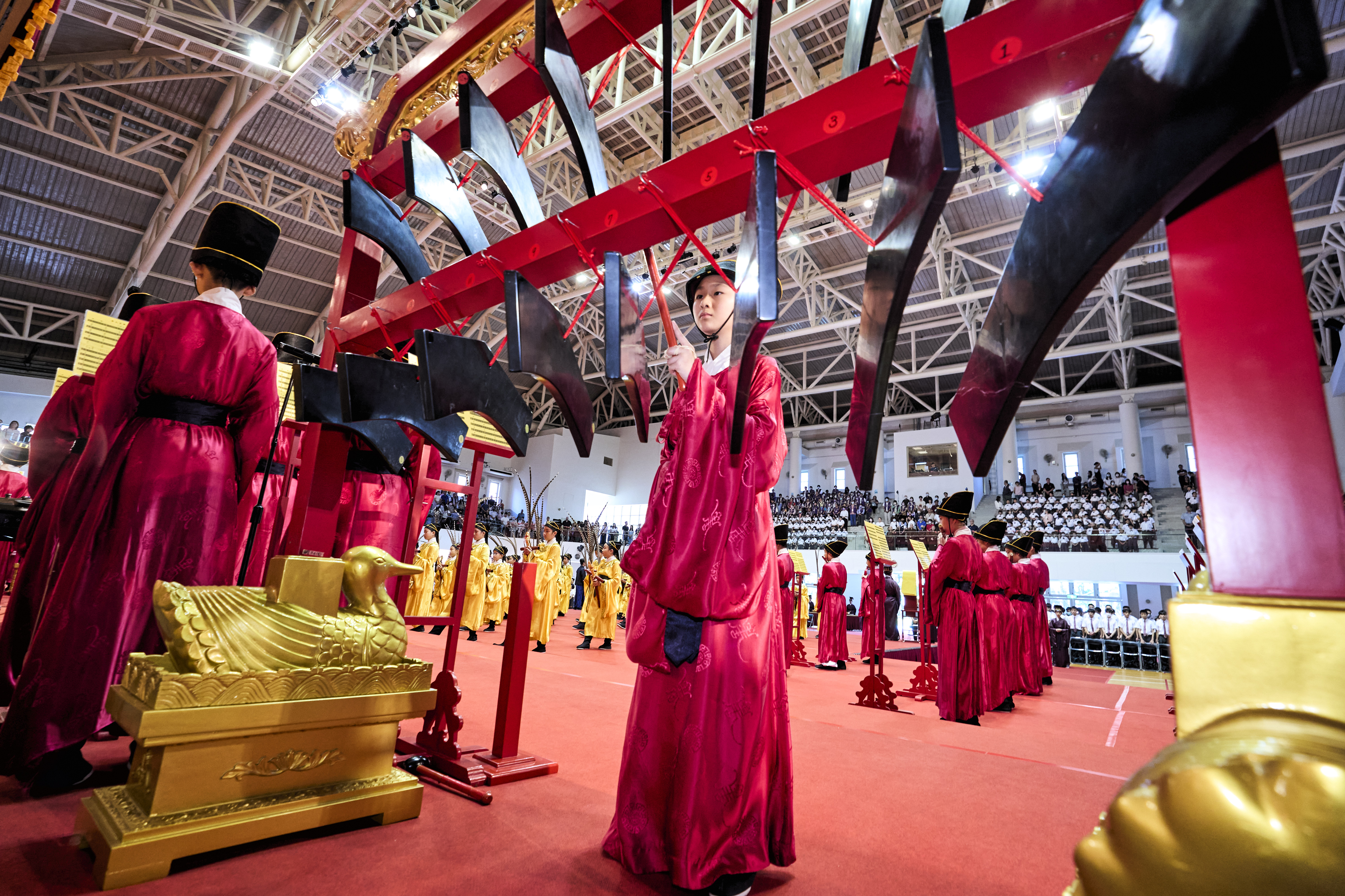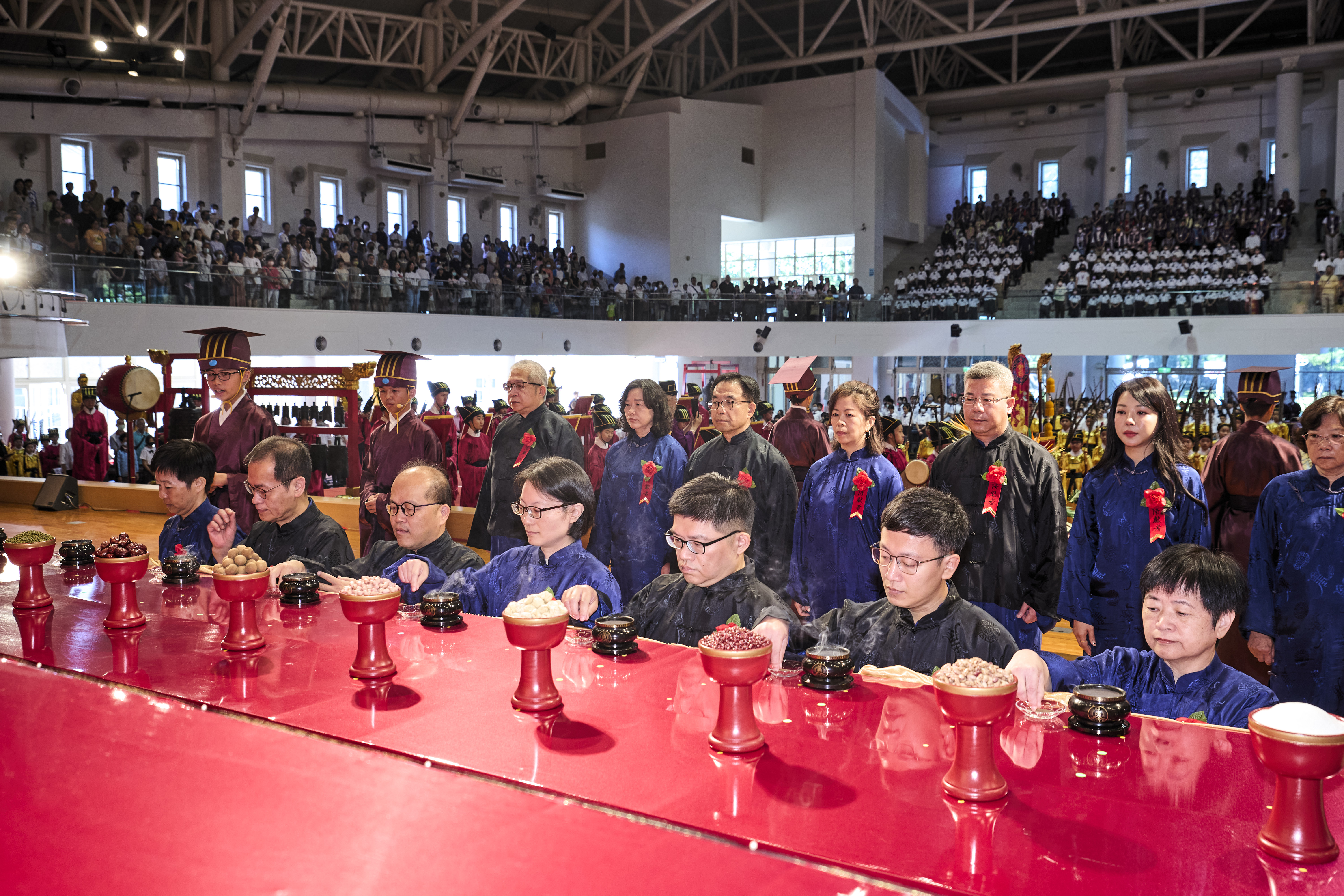 丹墀中央,佾生行列整肅,翟籥交映;禮生舉止合度,莊重恭謹;樂生八音齊奏,古樂《大成樂章》悠然迴盪,攝受人心。三生各司其職,完美合作,莊嚴中蘊含和諧之美。典禮尾聲,全體學子齊向師長行三鞠躬禮,表達謝師之情;隨後,在四年級學生的領誦下,千餘人同聲誦讀《論語》,再合唱〈禮運大同篇〉,鏗鏘誦聲響徹會場。「敬師釋奠典禮」不僅體現了「敬、慈、和、真」的校訓精神,更讓孩子們透過禮樂薰習,涵養尊師重道、謙和恭敬的品德,奠定未來成功人生的基石。
