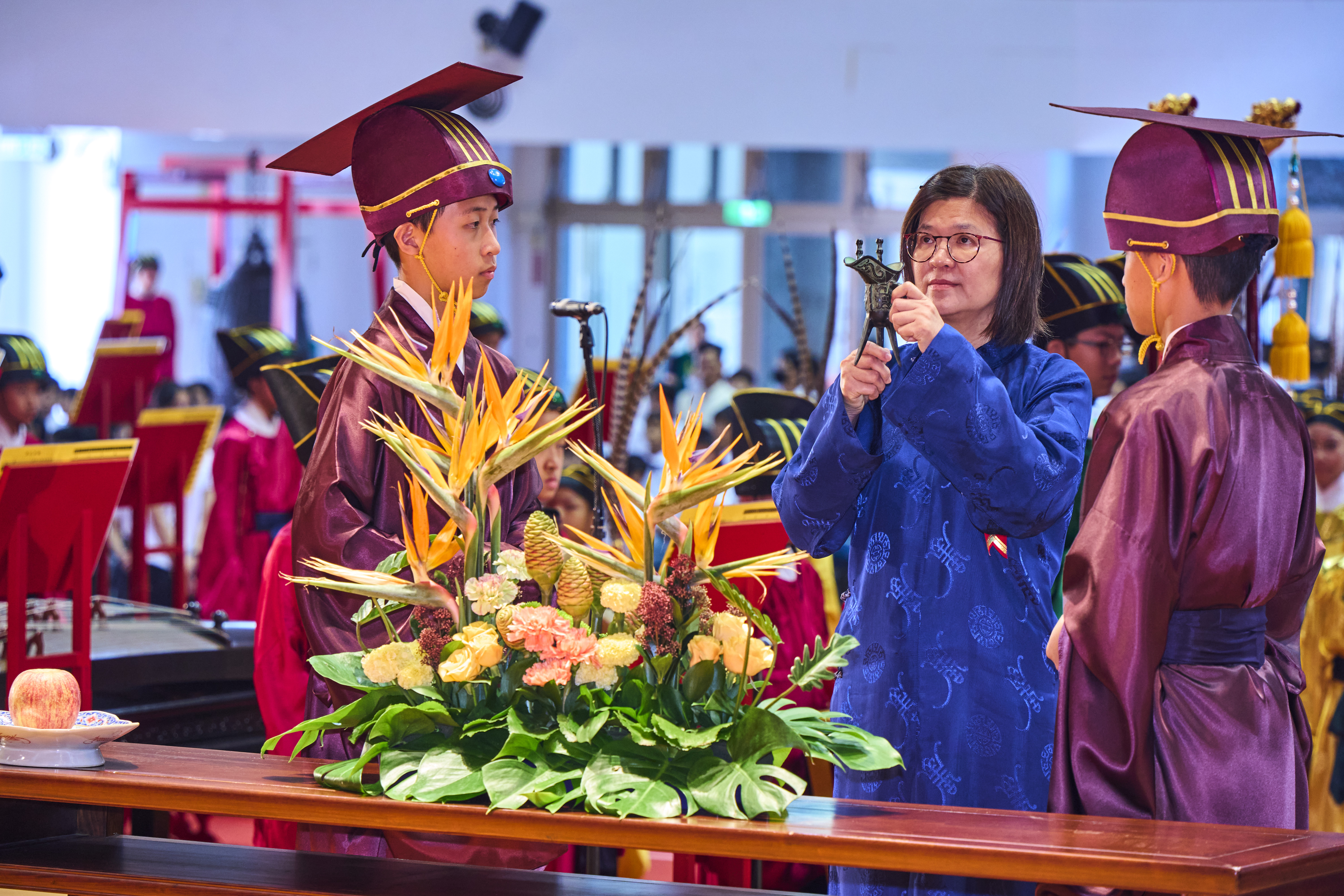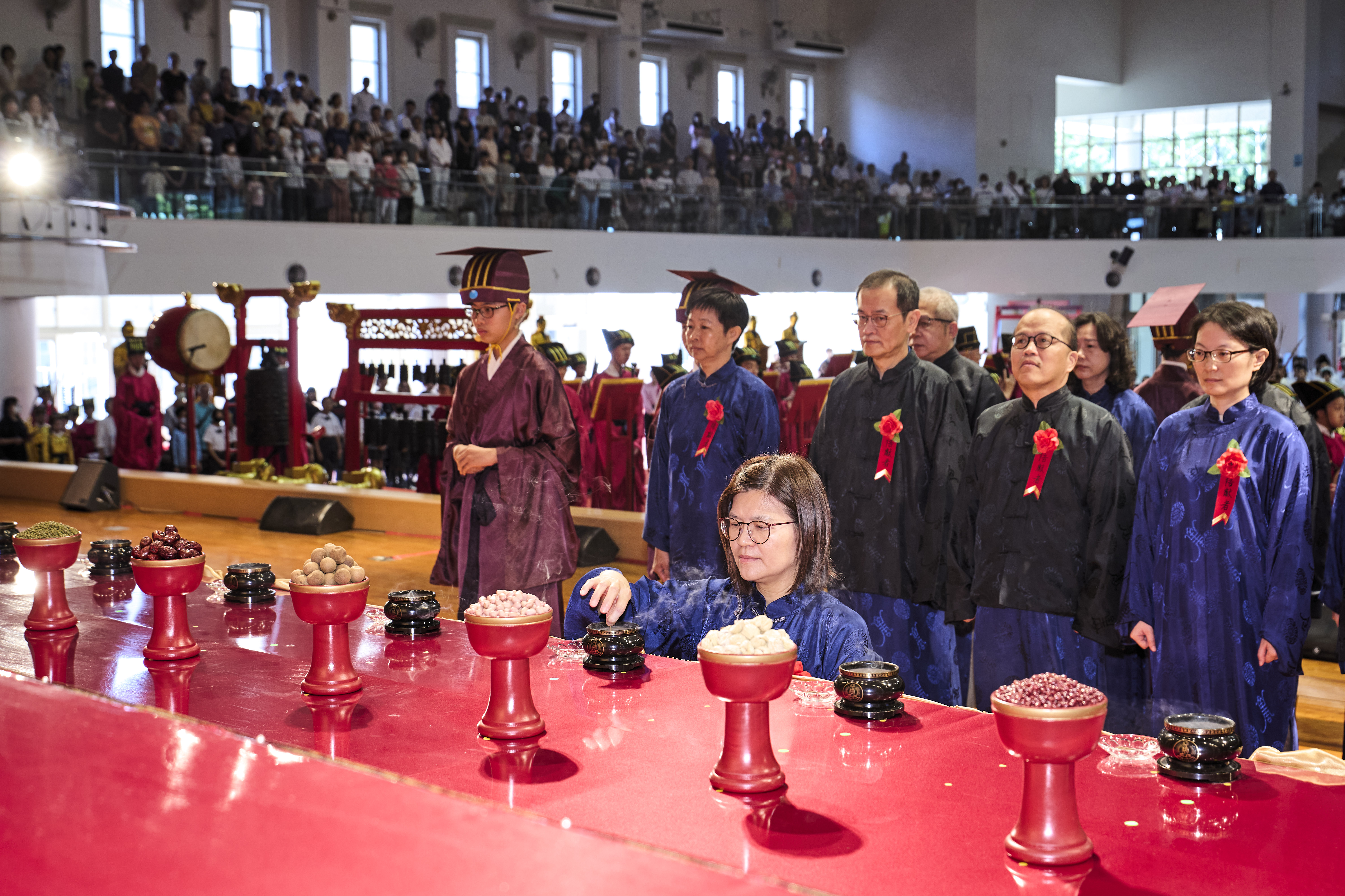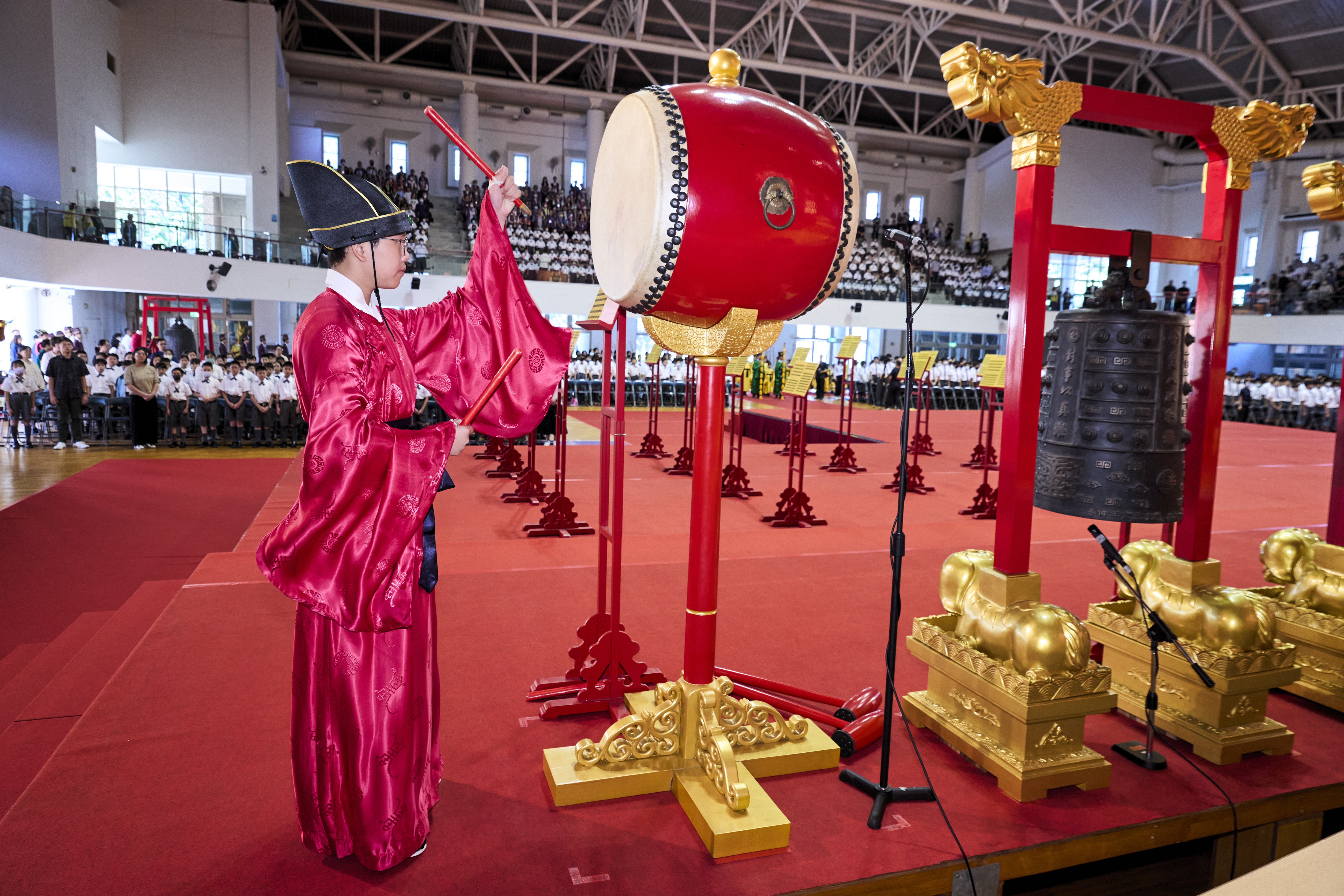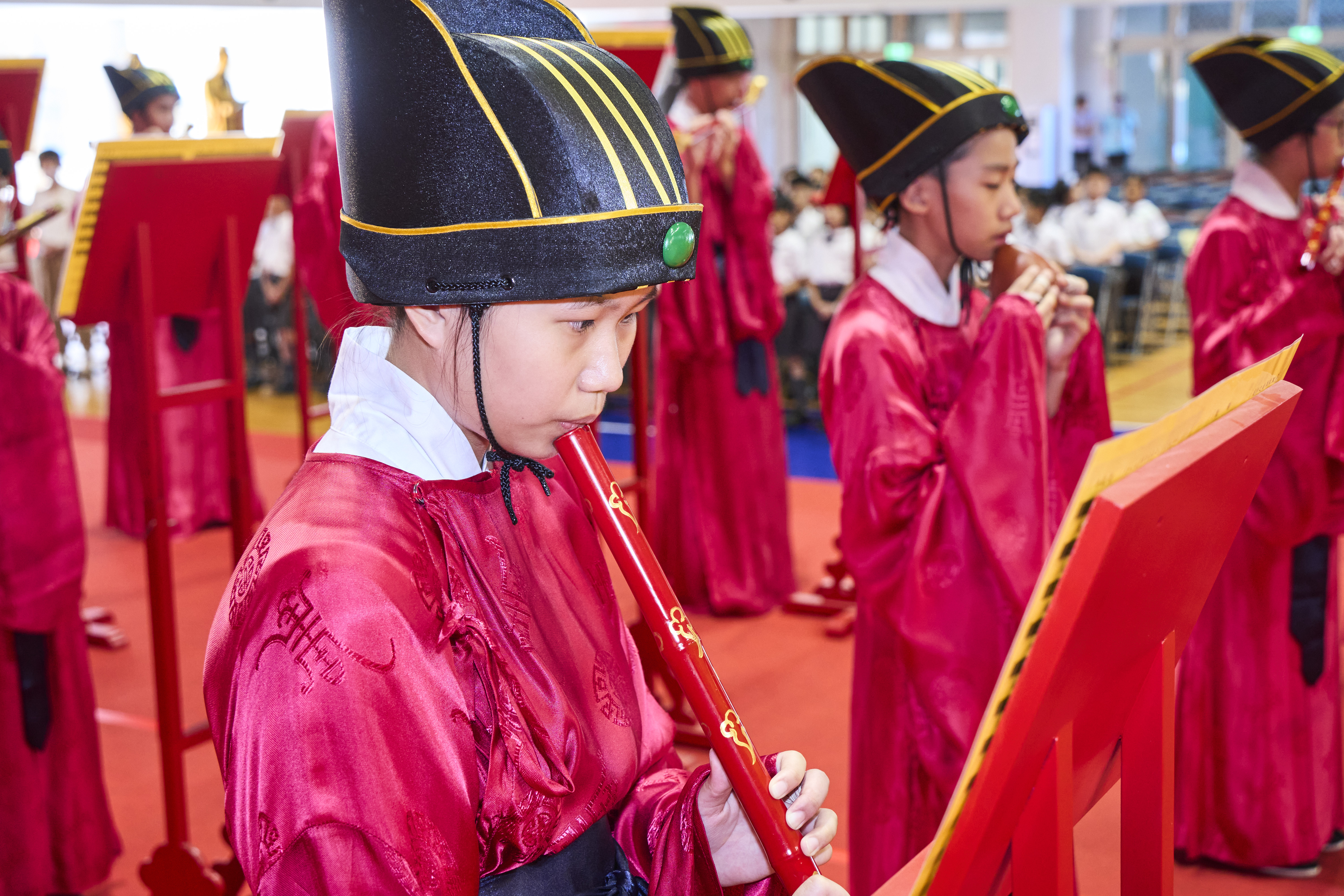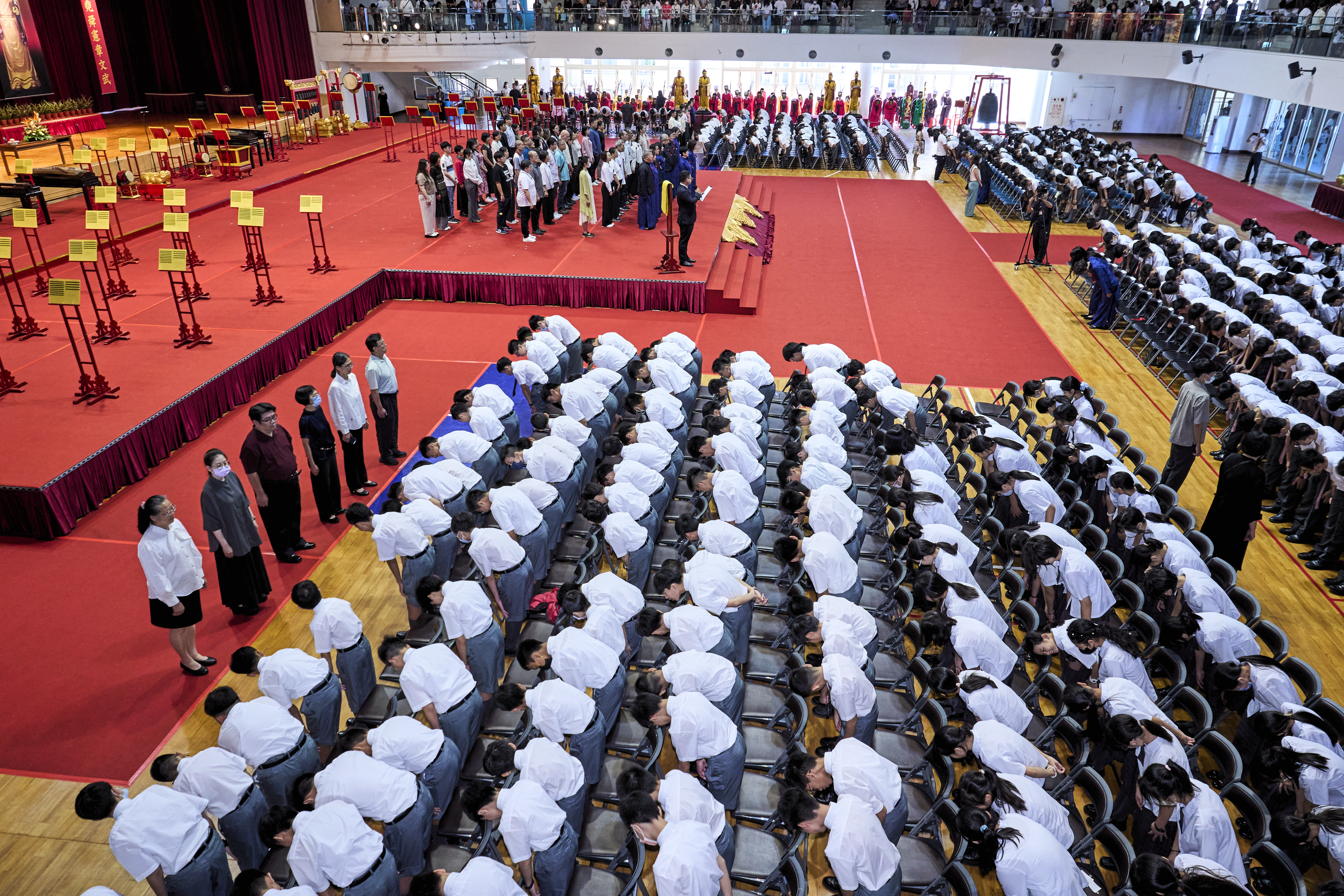 丹墀中央,佾生行列整肅,翟籥交映;禮生舉止合度,莊重恭謹;樂生八音齊奏,古樂《大成樂章》悠然迴盪,攝受人心。三生各司其職,完美合作,莊嚴中蘊含和諧之美。典禮尾聲,全體學子齊向師長行三鞠躬禮,表達謝師之情;隨後,在四年級學生的領誦下,千餘人同聲誦讀《論語》,再合唱〈禮運大同篇〉,鏗鏘誦聲響徹會場。「敬師釋奠典禮」不僅體現了「敬、慈、和、真」的校訓精神,更讓孩子們透過禮樂薰習,涵養尊師重道、謙和恭敬的品德,奠定未來成功人生的基石。