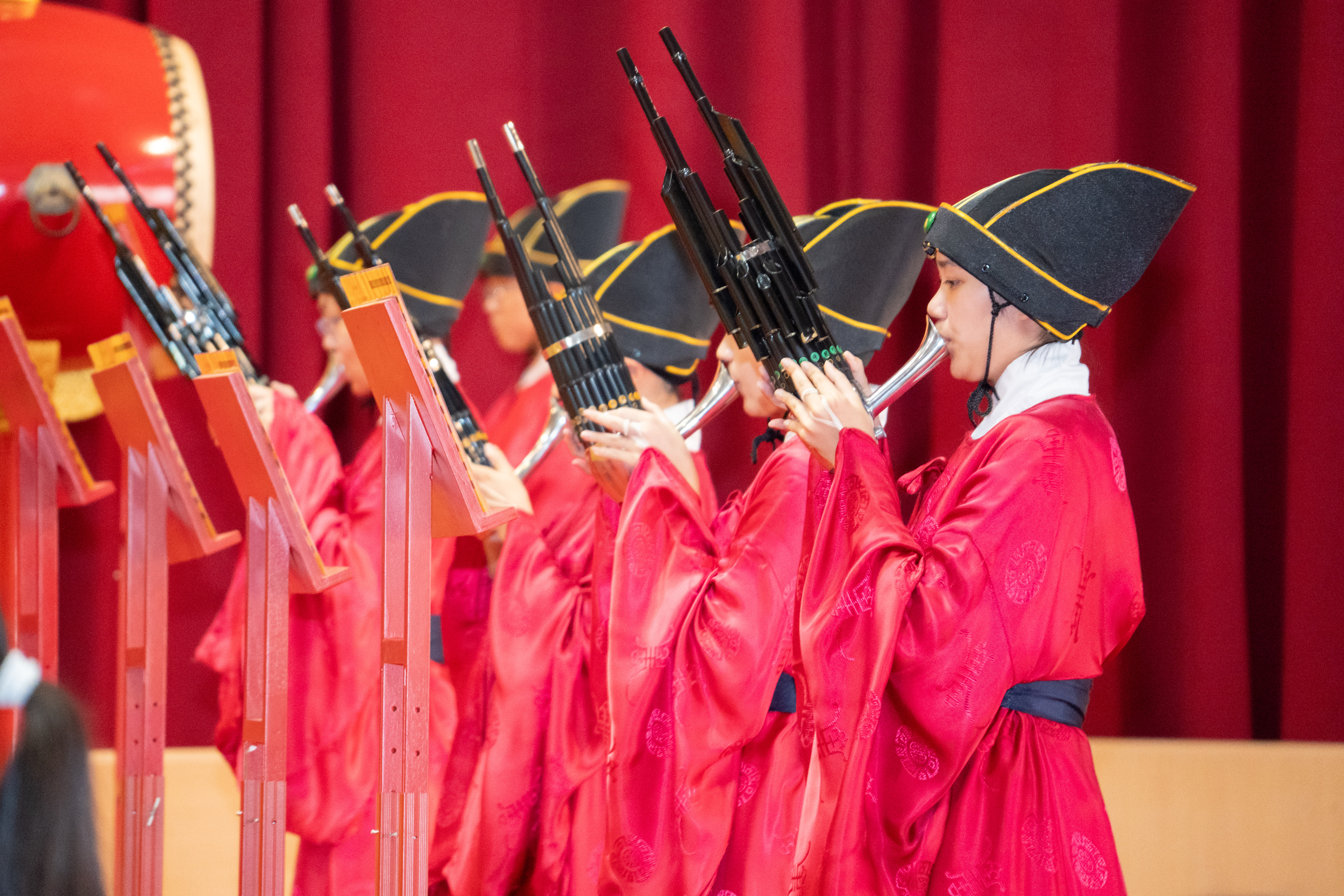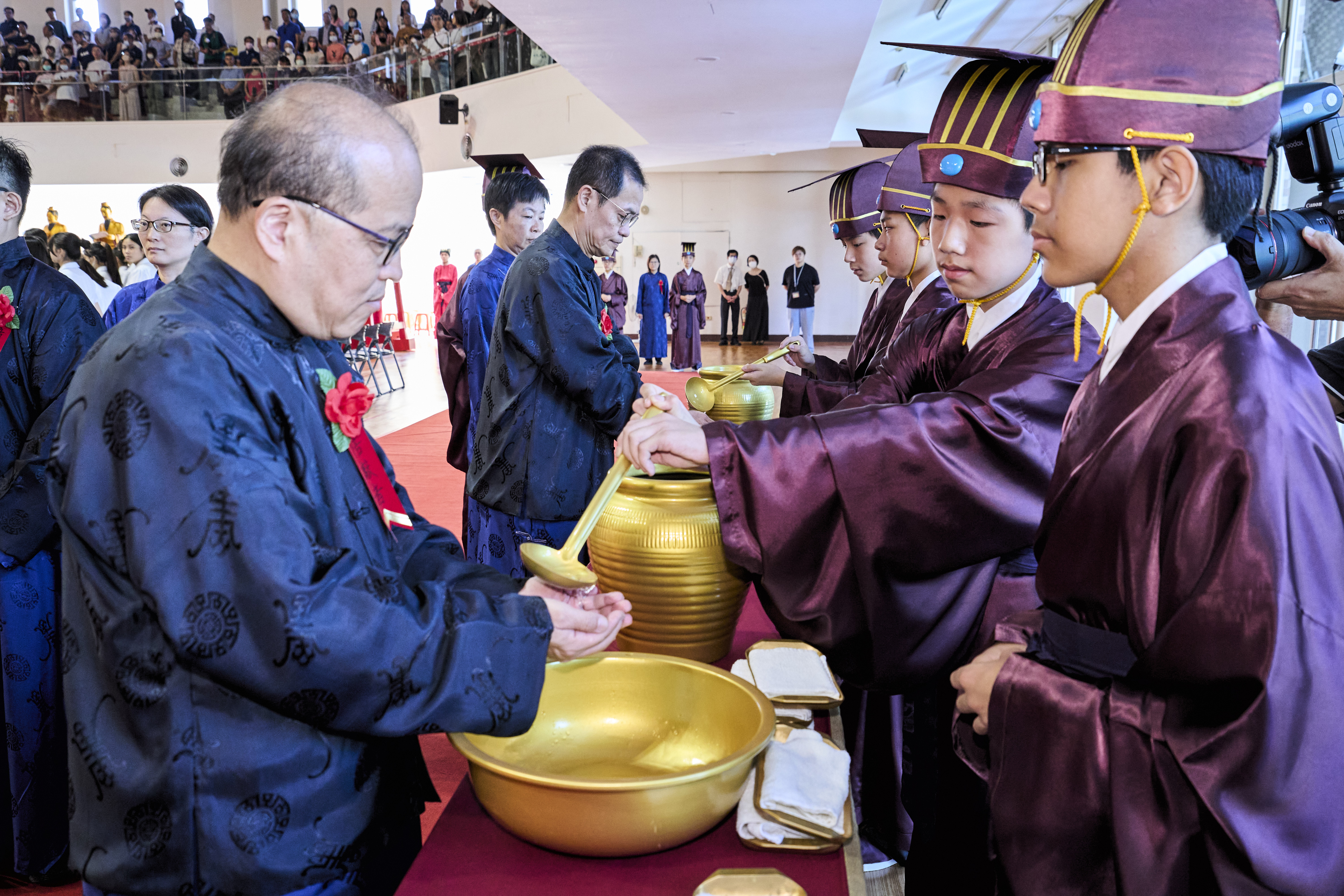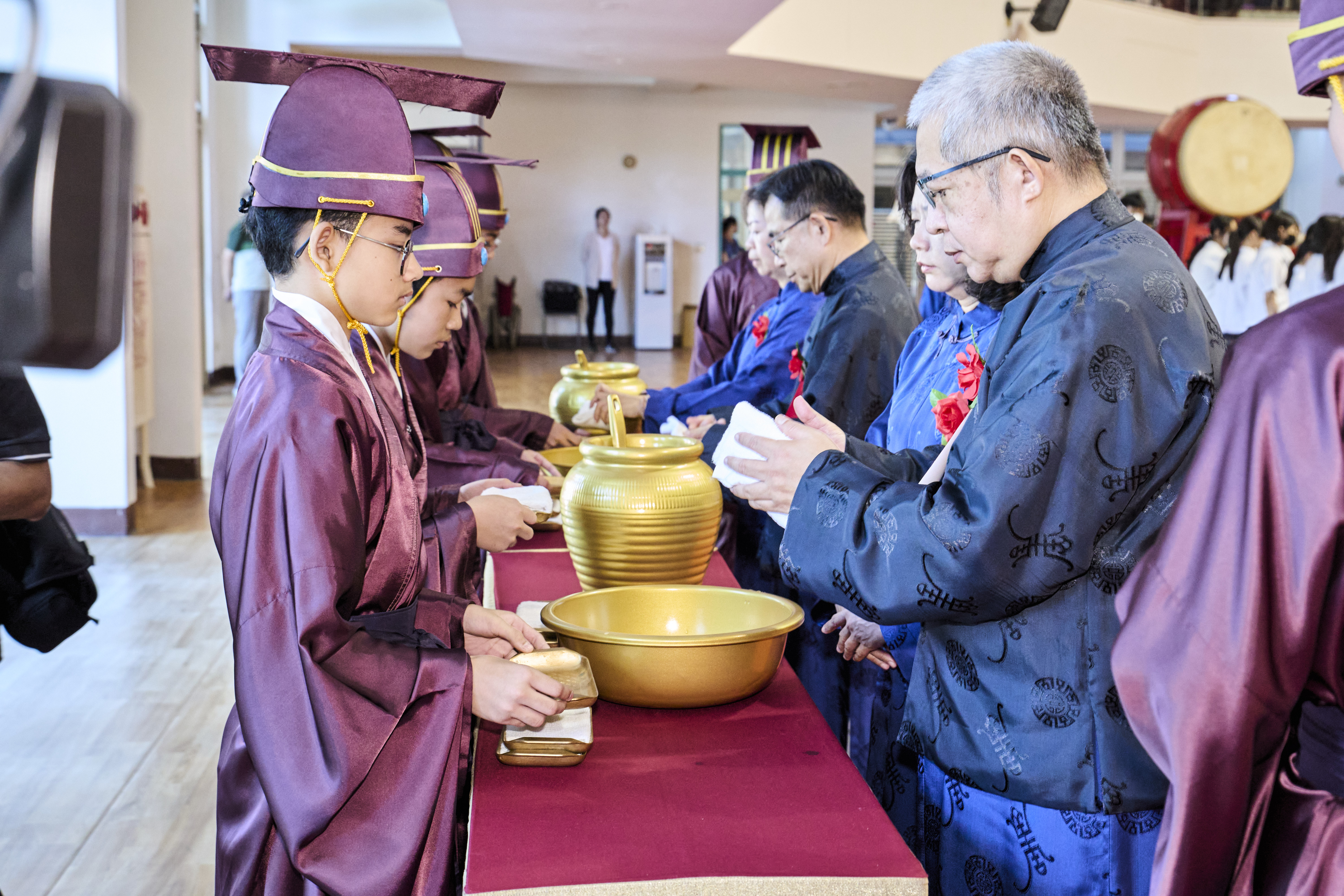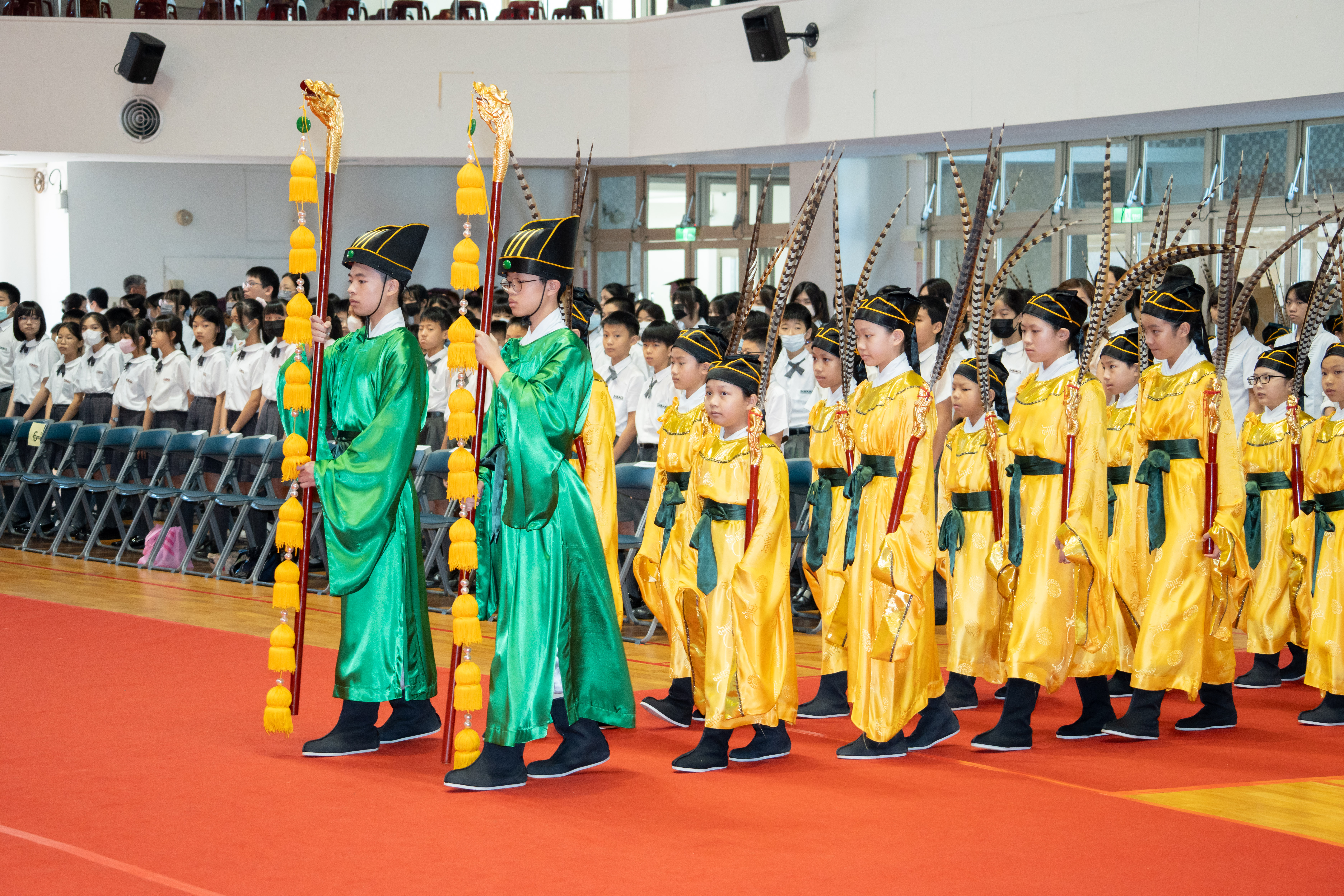 丹墀中央,佾生行列整肅,翟籥交映;禮生舉止合度,莊重恭謹;樂生八音齊奏,古樂《大成樂章》悠然迴盪,攝受人心。三生各司其職,完美合作,莊嚴中蘊含和諧之美。典禮尾聲,全體學子齊向師長行三鞠躬禮,表達謝師之情;隨後,在四年級學生的領誦下,千餘人同聲誦讀《論語》,再合唱〈禮運大同篇〉,鏗鏘誦聲響徹會場。「敬師釋奠典禮」不僅體現了「敬、慈、和、真」的校訓精神,更讓孩子們透過禮樂薰習,涵養尊師重道、謙和恭敬的品德,奠定未來成功人生的基石。