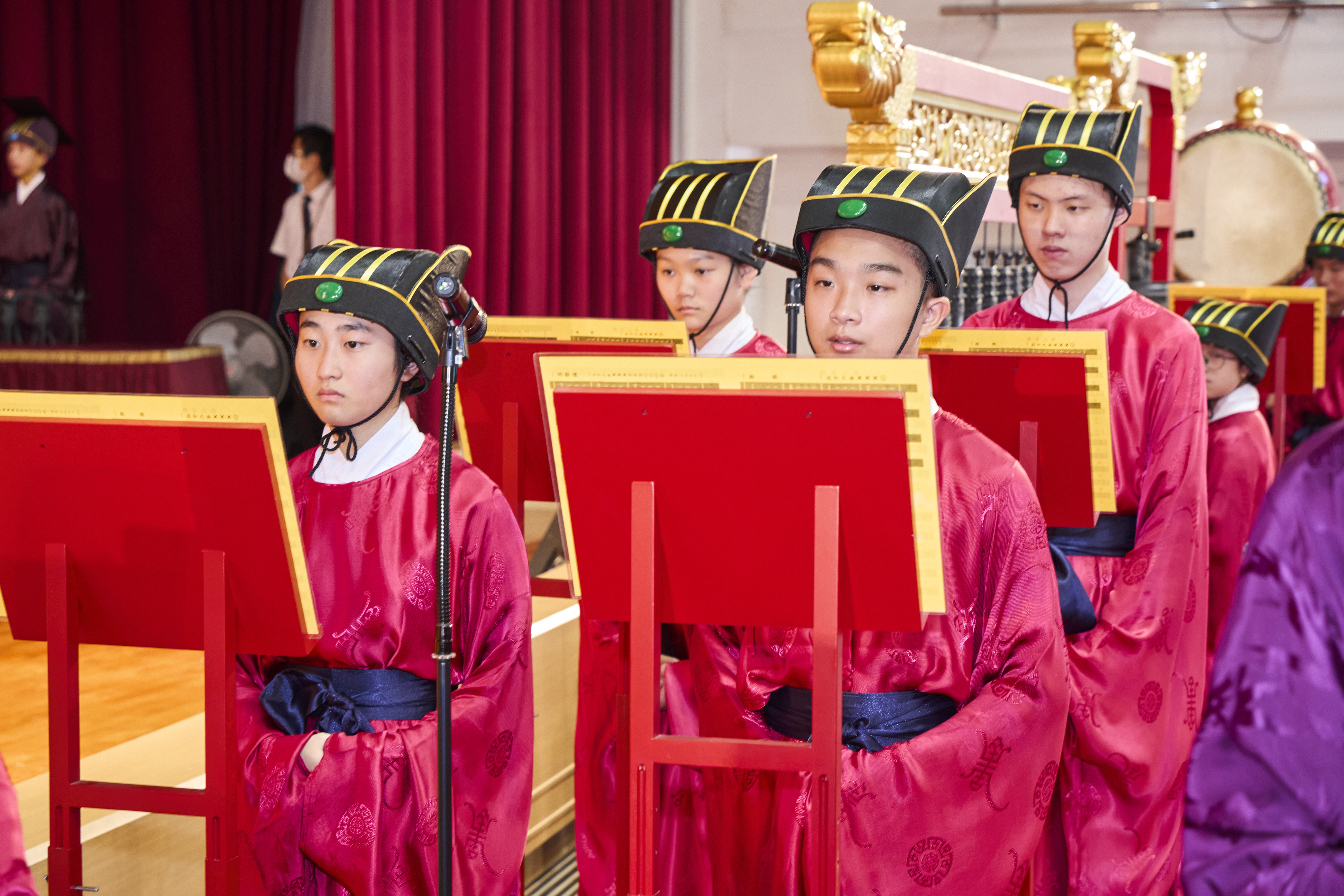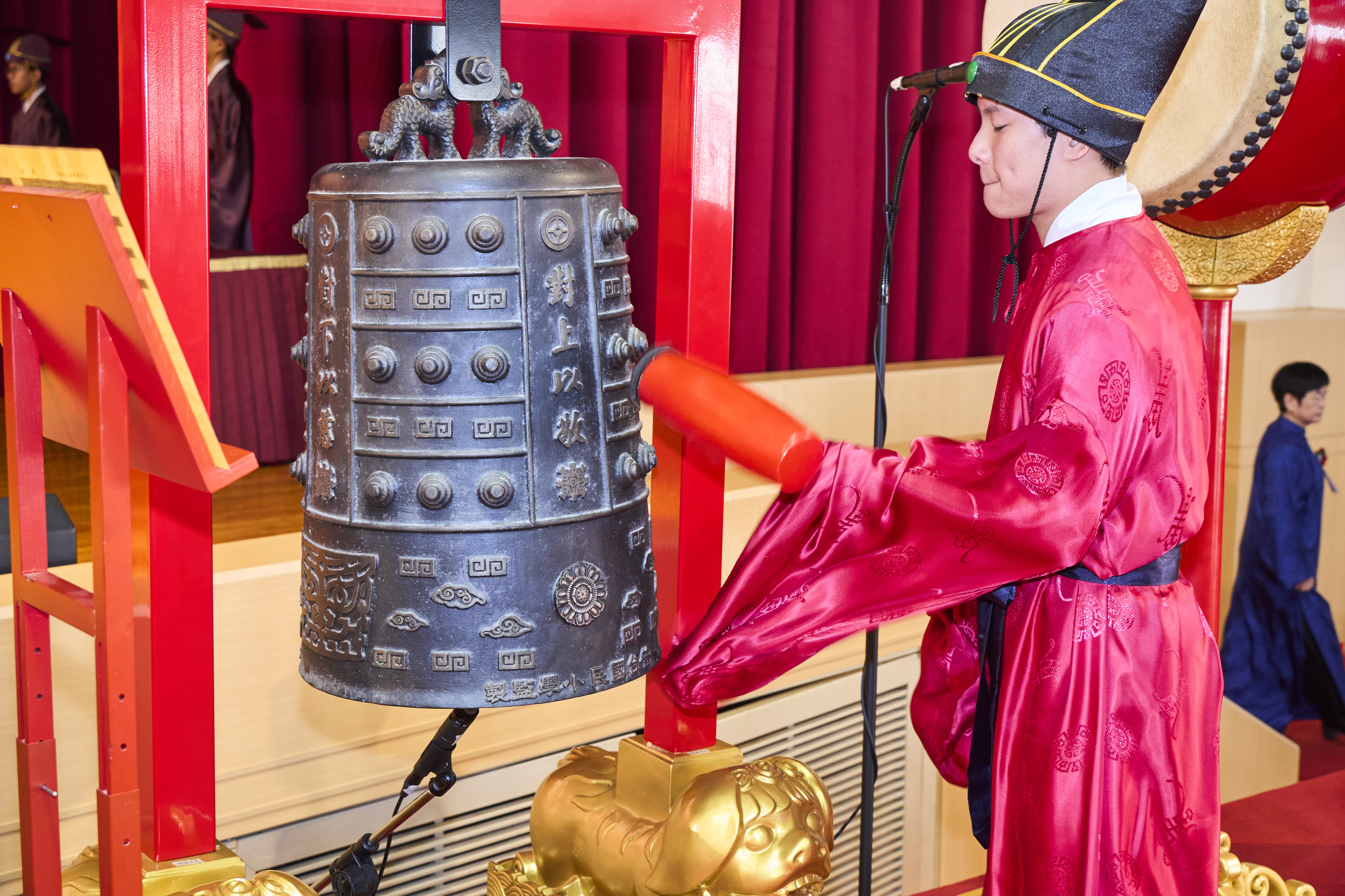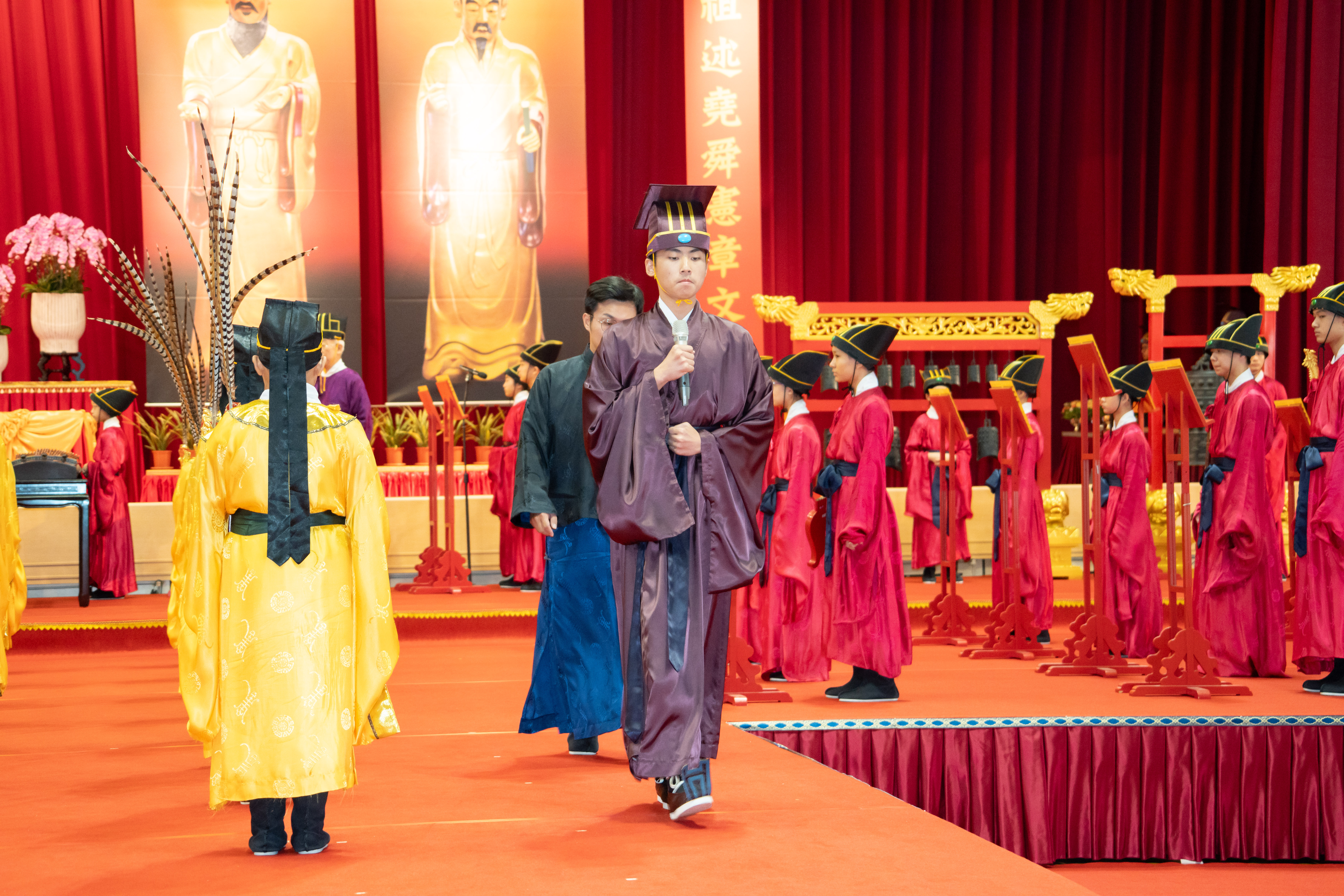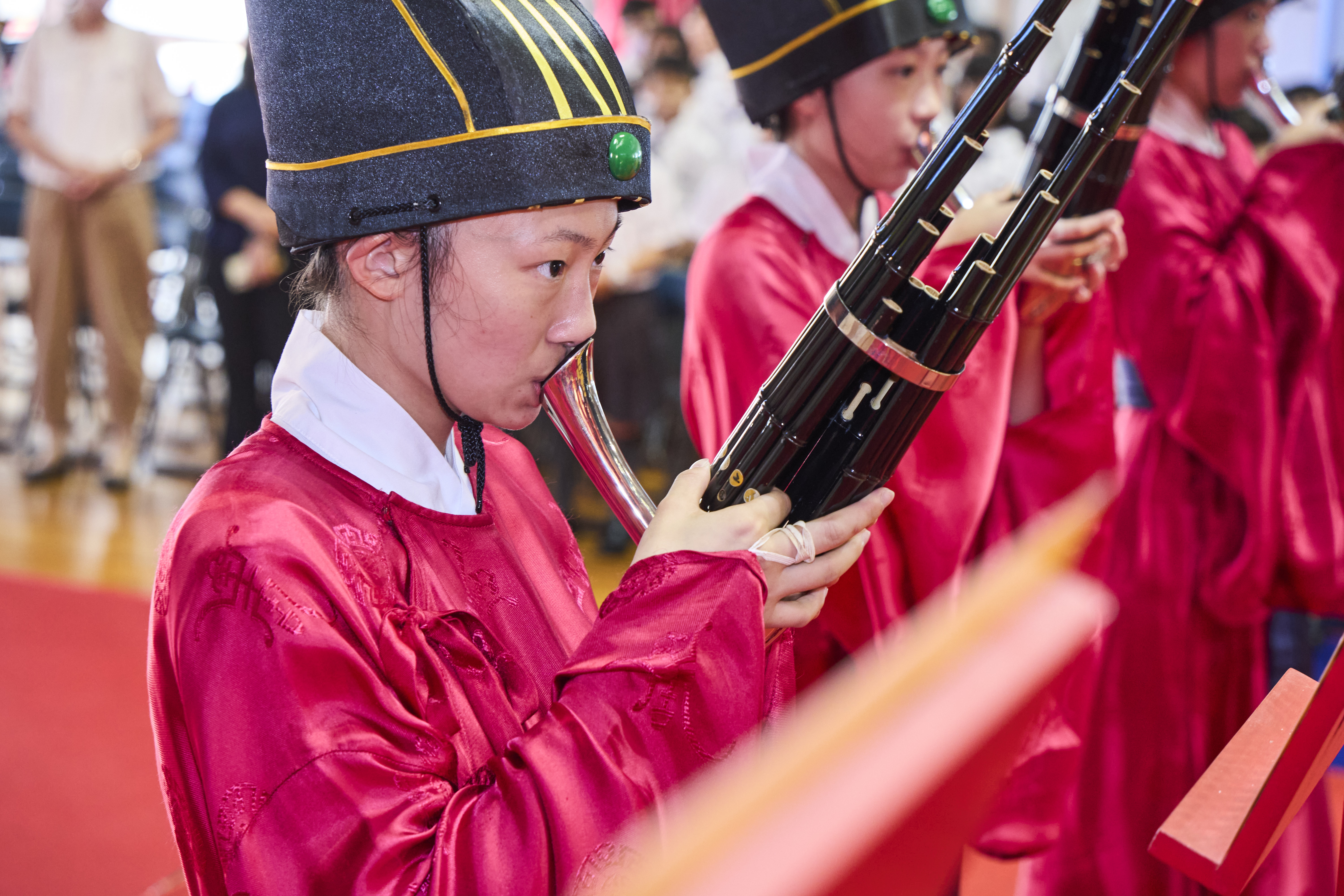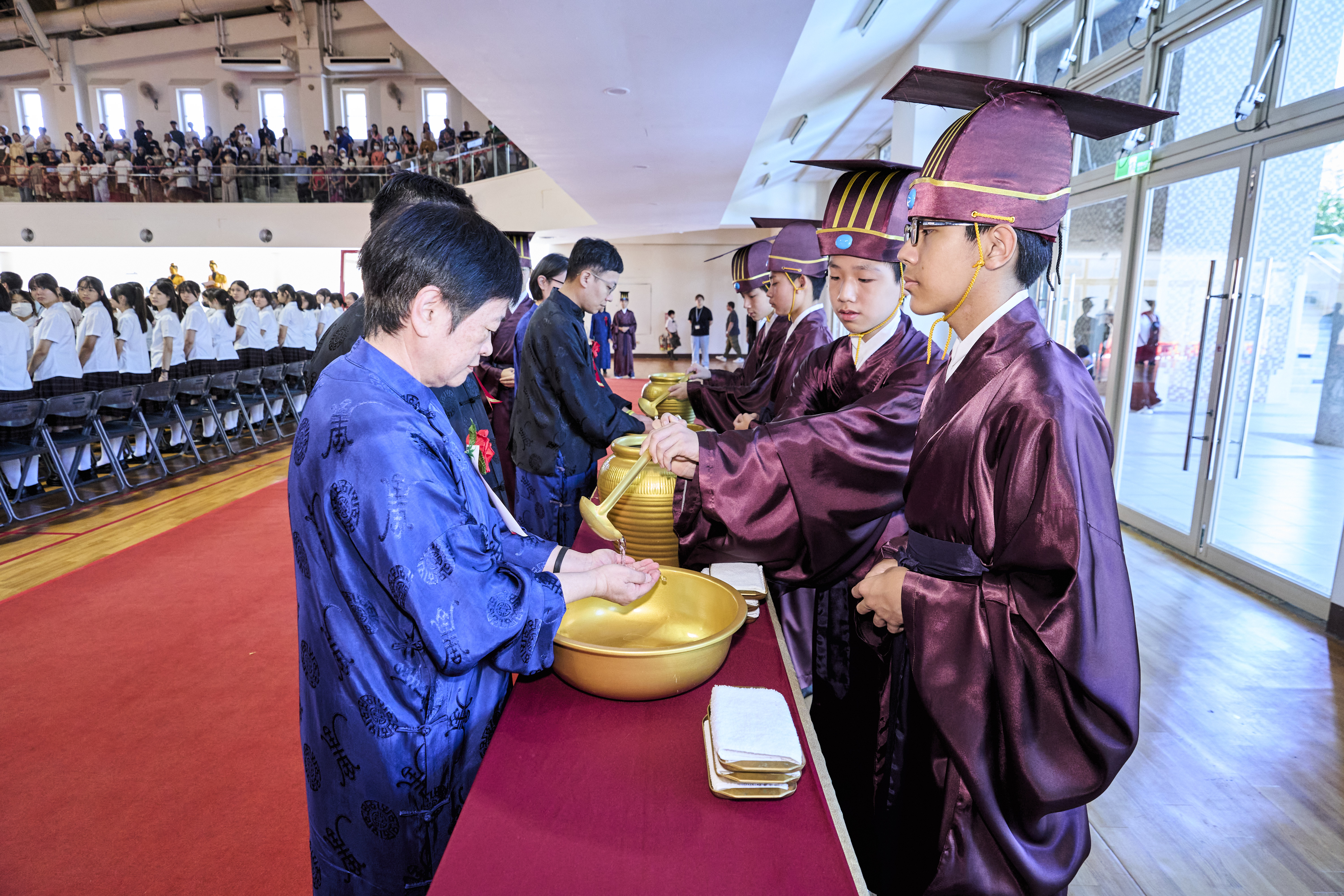 丹墀中央,佾生行列整肅,翟籥交映;禮生舉止合度,莊重恭謹;樂生八音齊奏,古樂《大成樂章》悠然迴盪,攝受人心。三生各司其職,完美合作,莊嚴中蘊含和諧之美。典禮尾聲,全體學子齊向師長行三鞠躬禮,表達謝師之情;隨後,在四年級學生的領誦下,千餘人同聲誦讀《論語》,再合唱〈禮運大同篇〉,鏗鏘誦聲響徹會場。「敬師釋奠典禮」不僅體現了「敬、慈、和、真」的校訓精神,更讓孩子們透過禮樂薰習,涵養尊師重道、謙和恭敬的品德,奠定未來成功人生的基石。