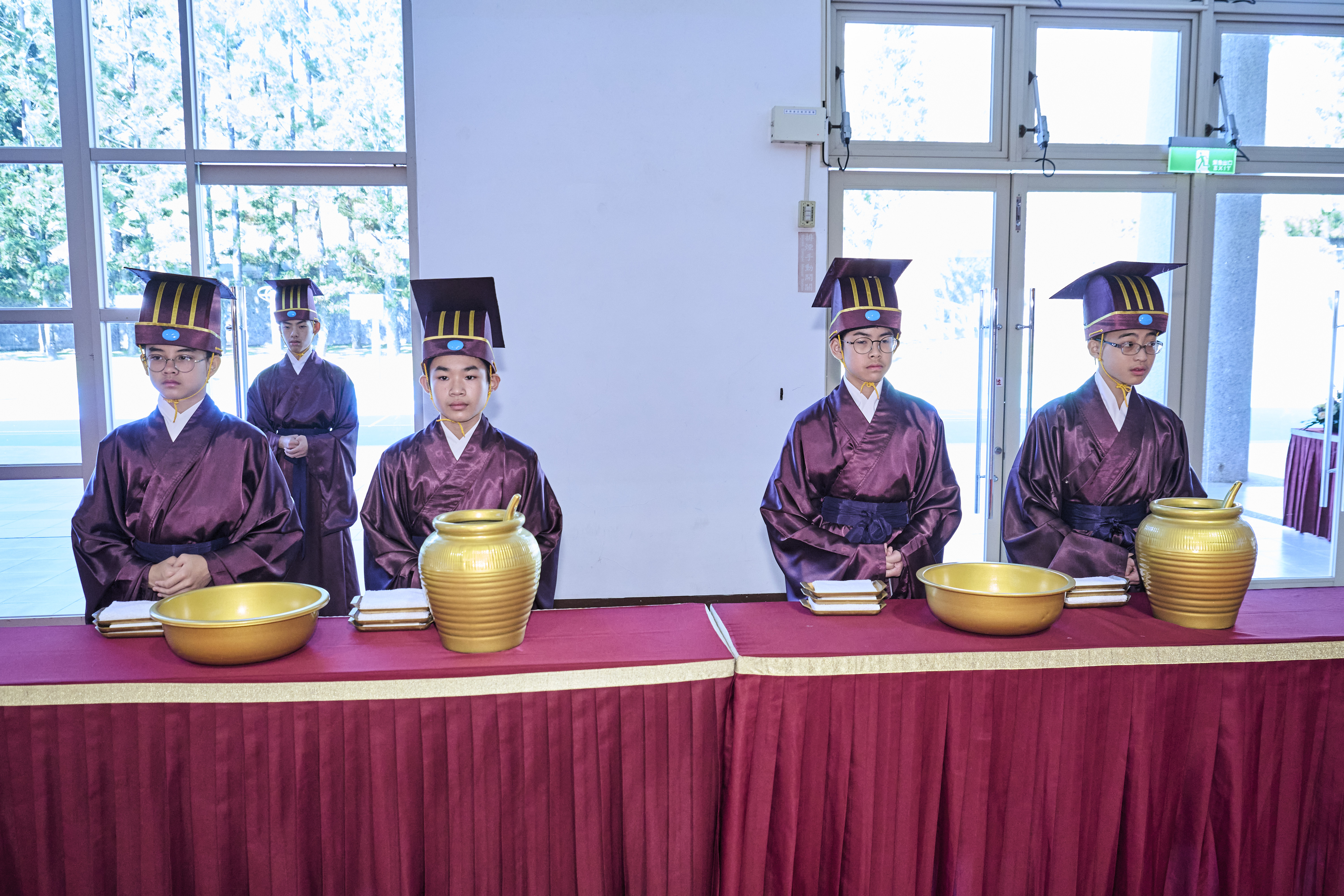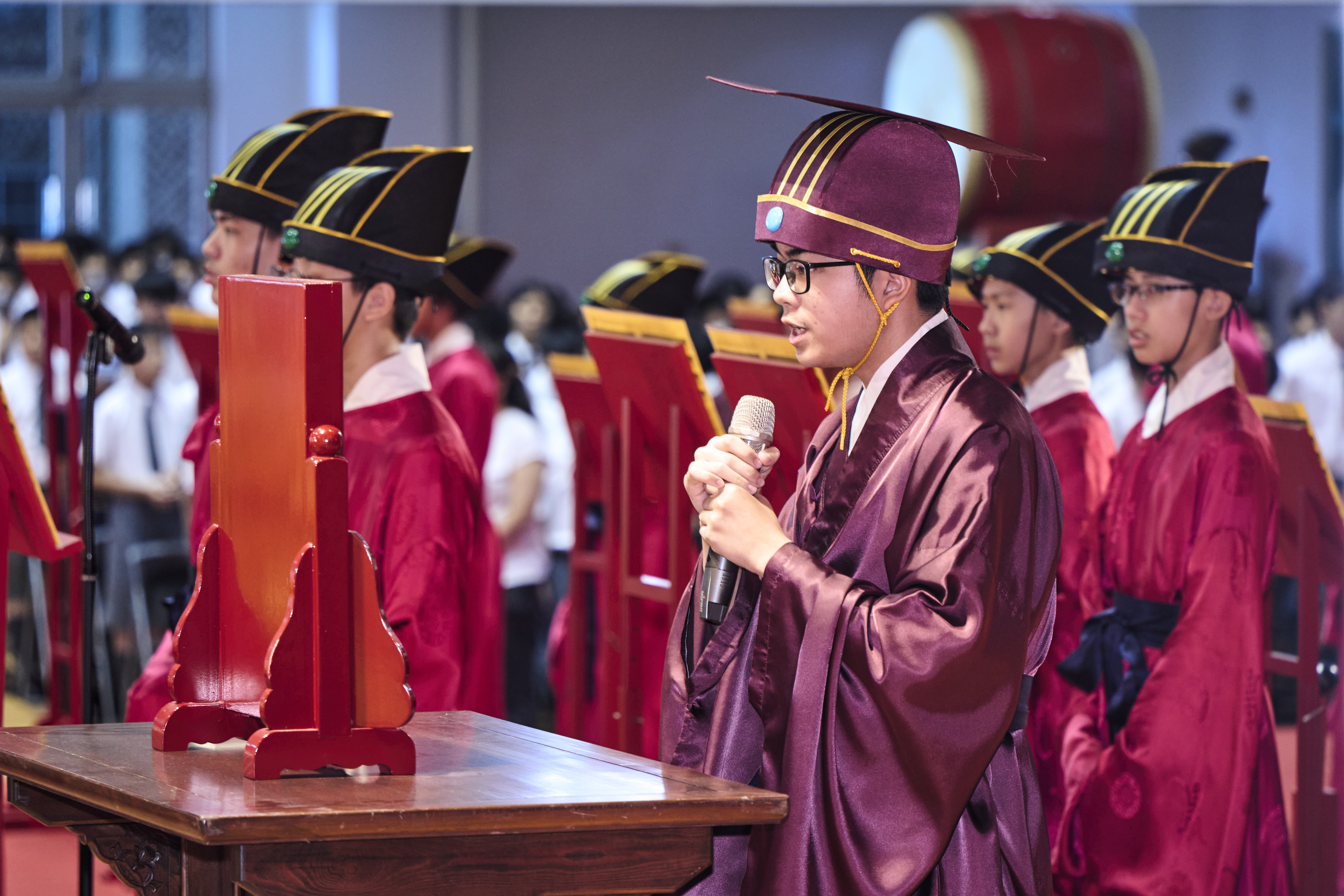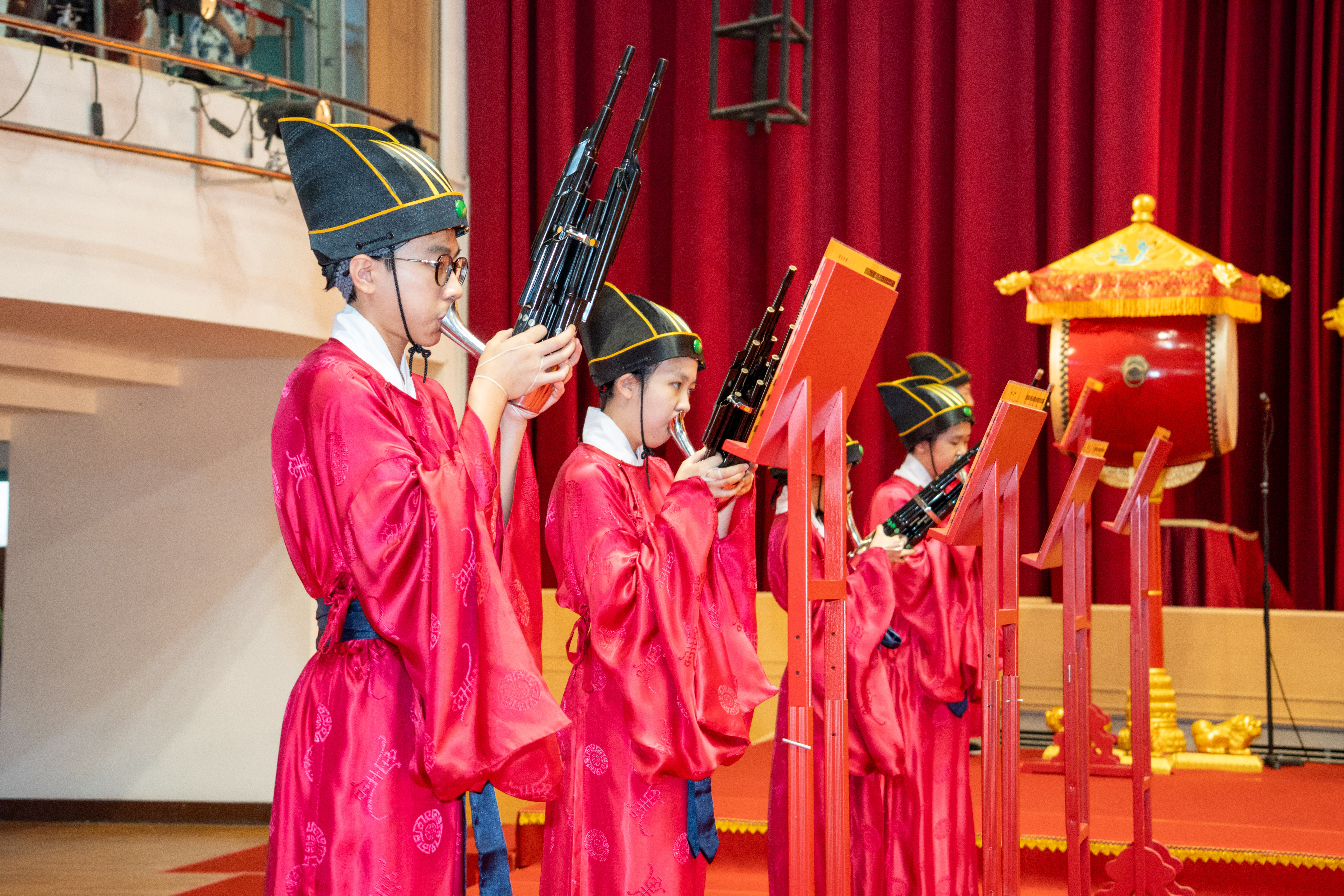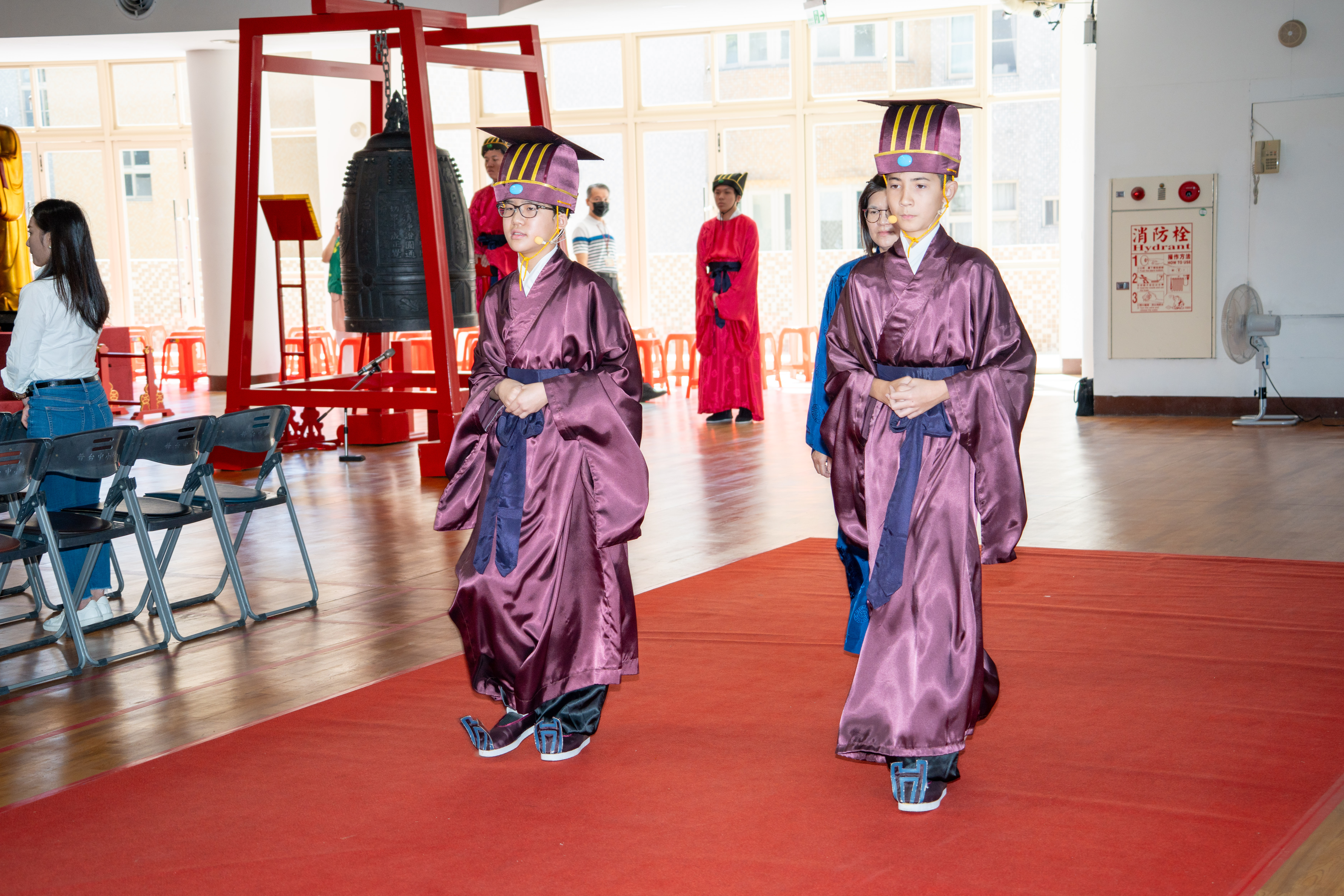 丹墀中央,佾生行列整肅,翟籥交映;禮生舉止合度,莊重恭謹;樂生八音齊奏,古樂《大成樂章》悠然迴盪,攝受人心。三生各司其職,完美合作,莊嚴中蘊含和諧之美。典禮尾聲,全體學子齊向師長行三鞠躬禮,表達謝師之情;隨後,在四年級學生的領誦下,千餘人同聲誦讀《論語》,再合唱〈禮運大同篇〉,鏗鏘誦聲響徹會場。「敬師釋奠典禮」不僅體現了「敬、慈、和、真」的校訓精神,更讓孩子們透過禮樂薰習,涵養尊師重道、謙和恭敬的品德,奠定未來成功人生的基石。
