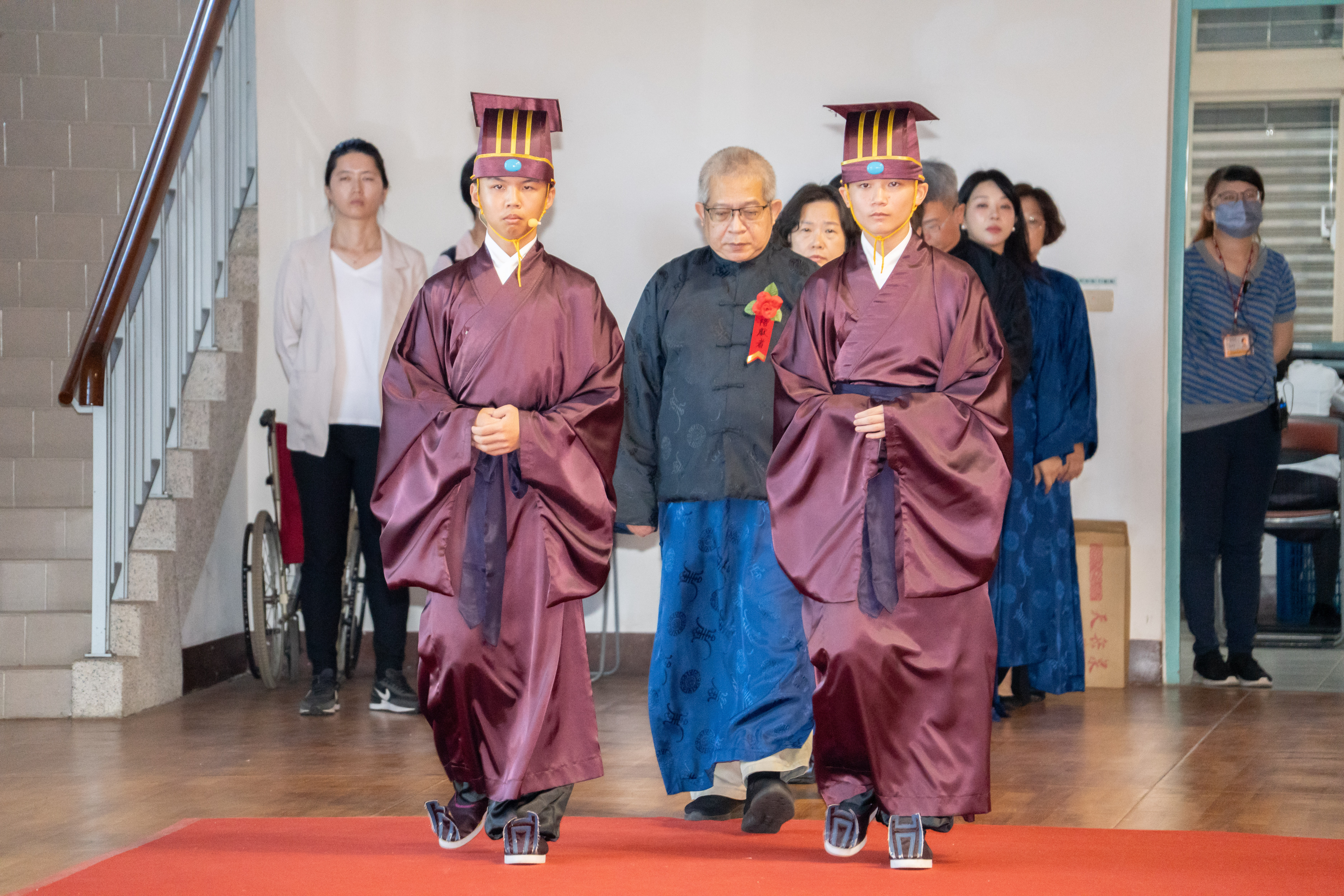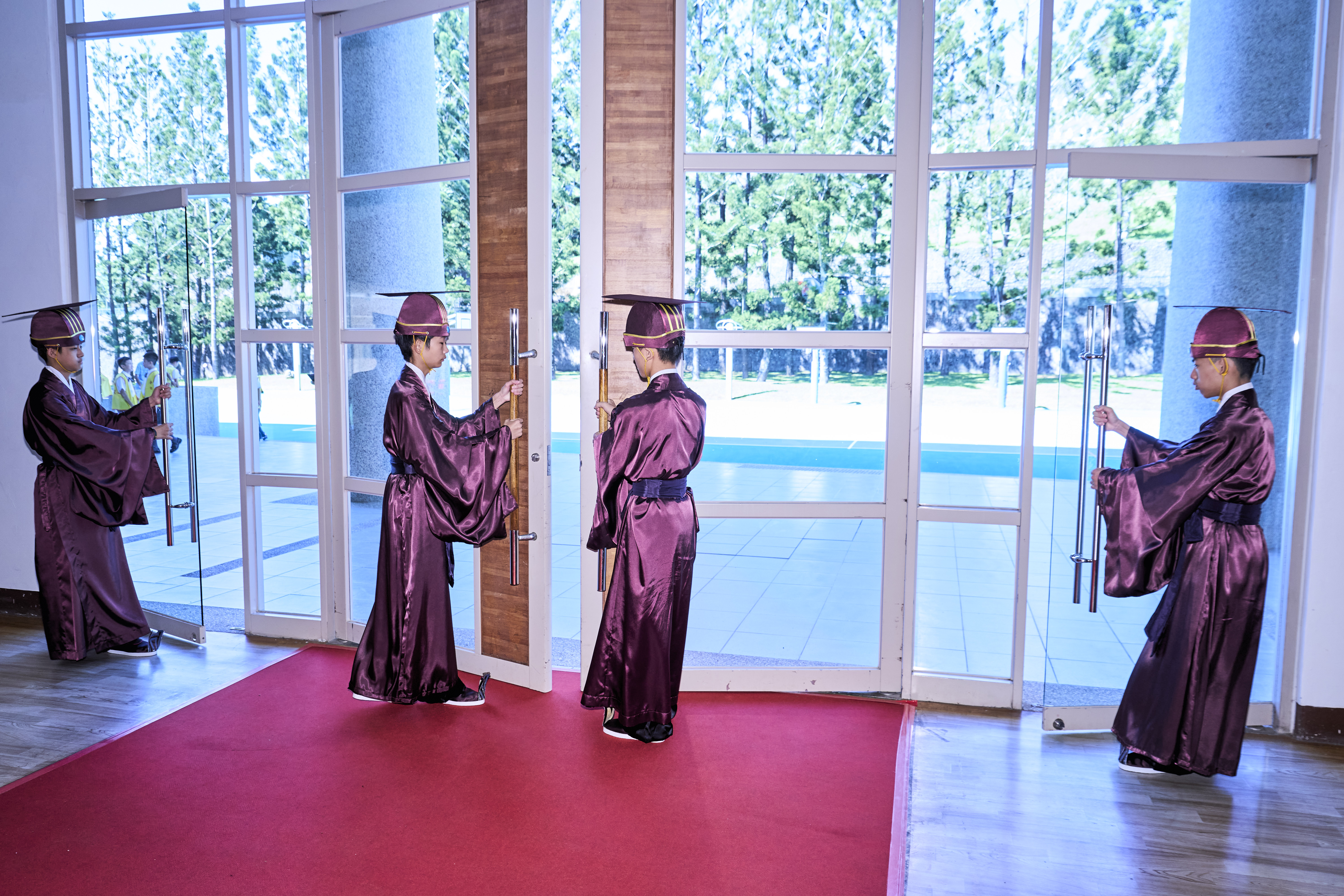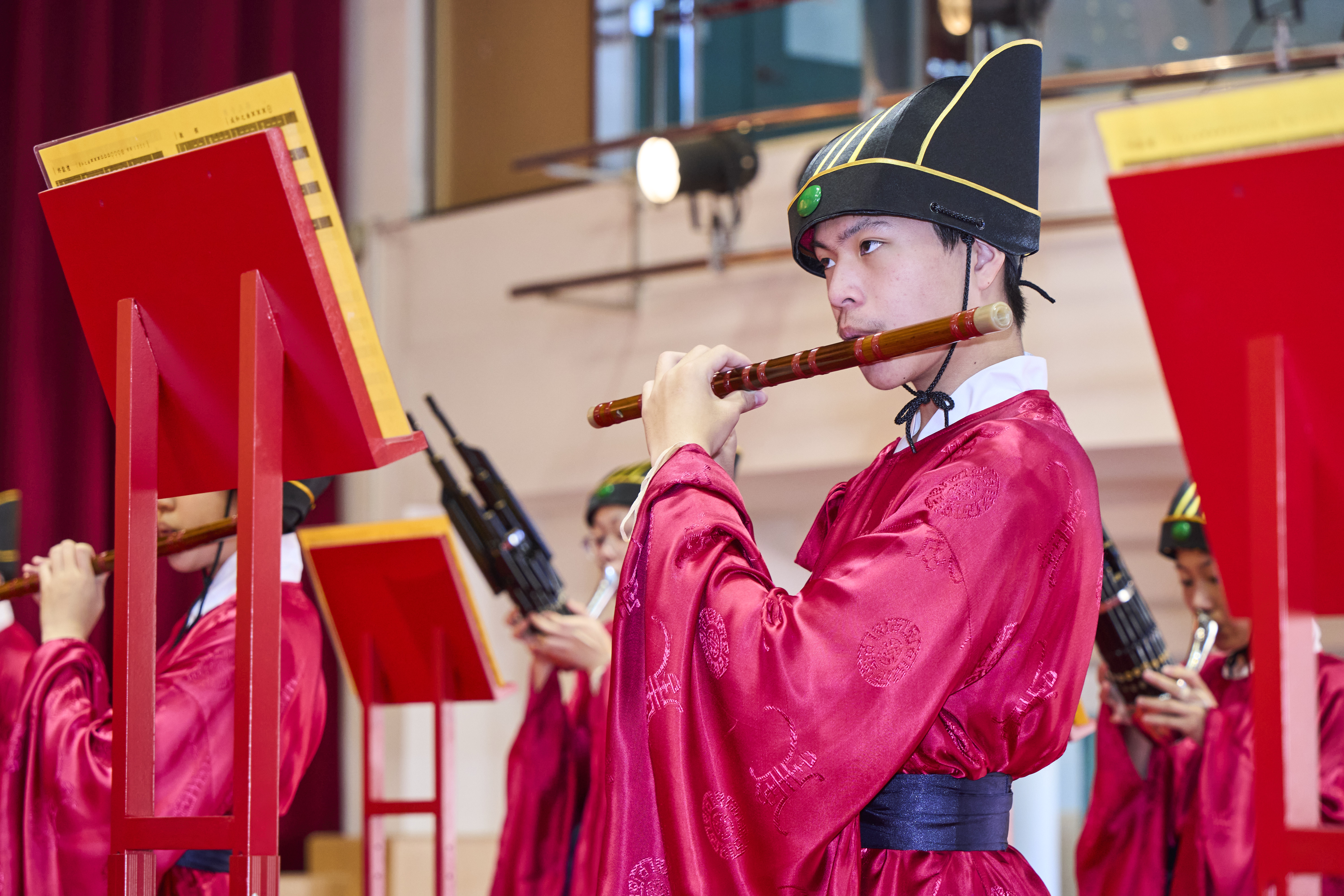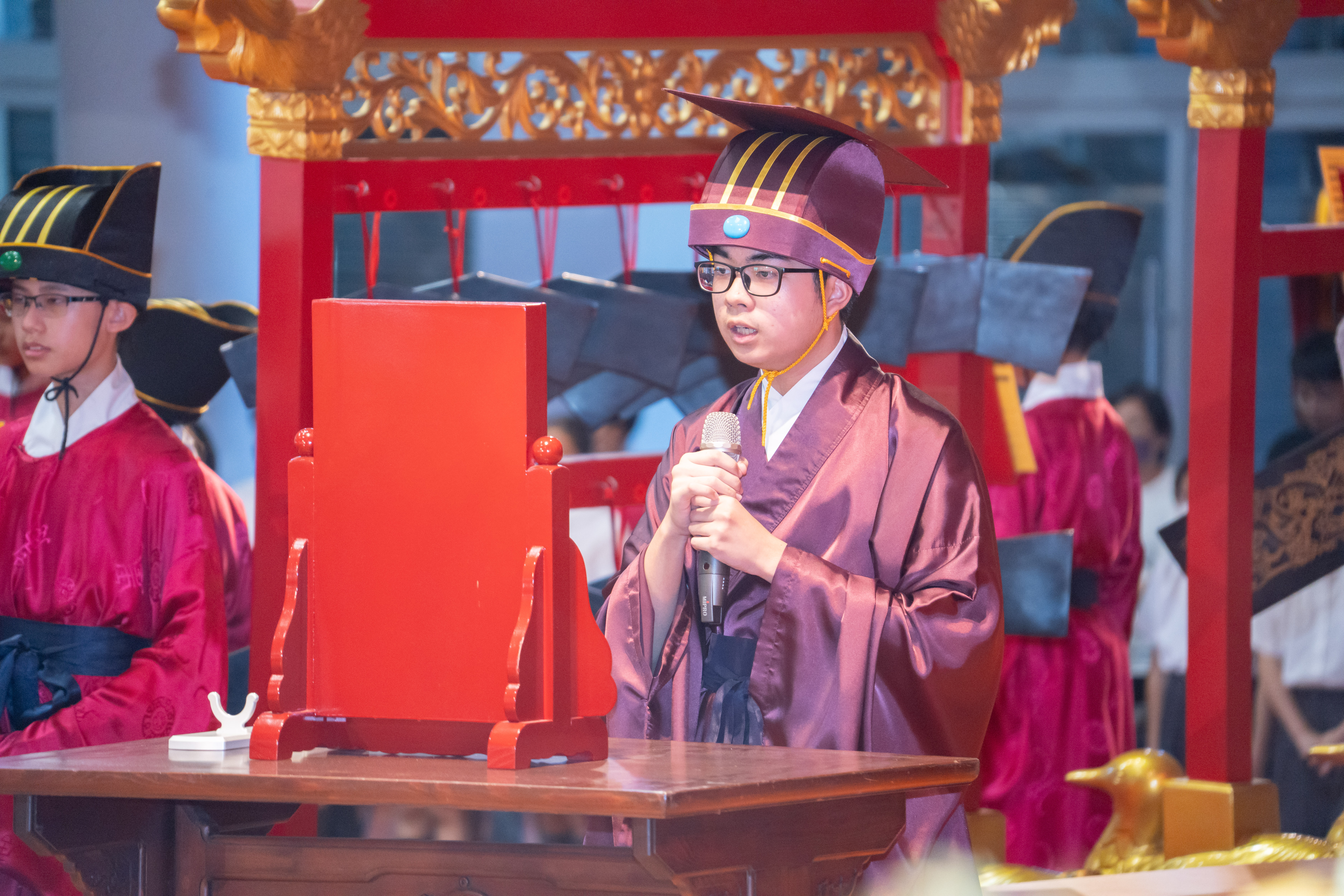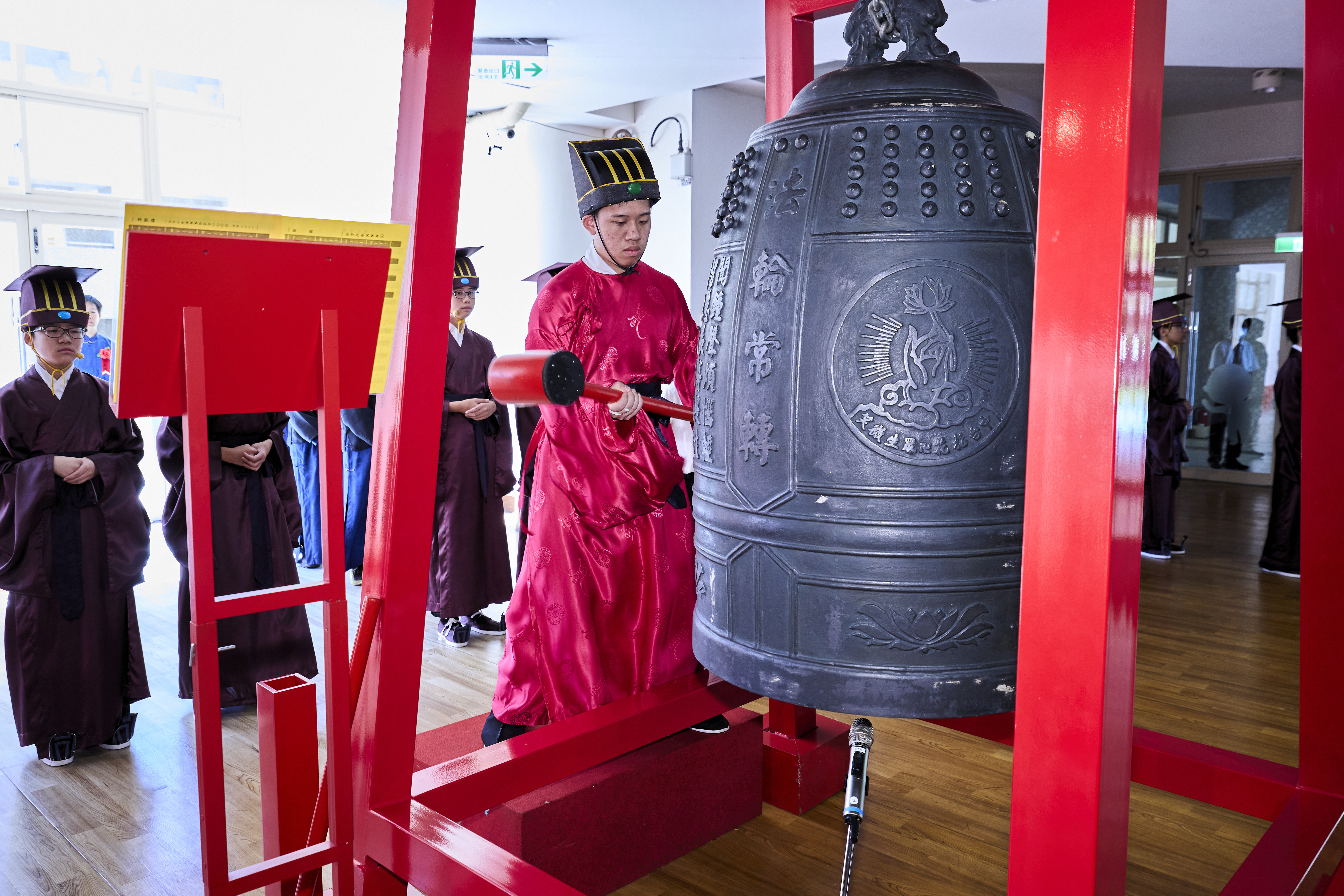 丹墀中央,佾生行列整肅,翟籥交映;禮生舉止合度,莊重恭謹;樂生八音齊奏,古樂《大成樂章》悠然迴盪,攝受人心。三生各司其職,完美合作,莊嚴中蘊含和諧之美。典禮尾聲,全體學子齊向師長行三鞠躬禮,表達謝師之情;隨後,在四年級學生的領誦下,千餘人同聲誦讀《論語》,再合唱〈禮運大同篇〉,鏗鏘誦聲響徹會場。「敬師釋奠典禮」不僅體現了「敬、慈、和、真」的校訓精神,更讓孩子們透過禮樂薰習,涵養尊師重道、謙和恭敬的品德,奠定未來成功人生的基石。
