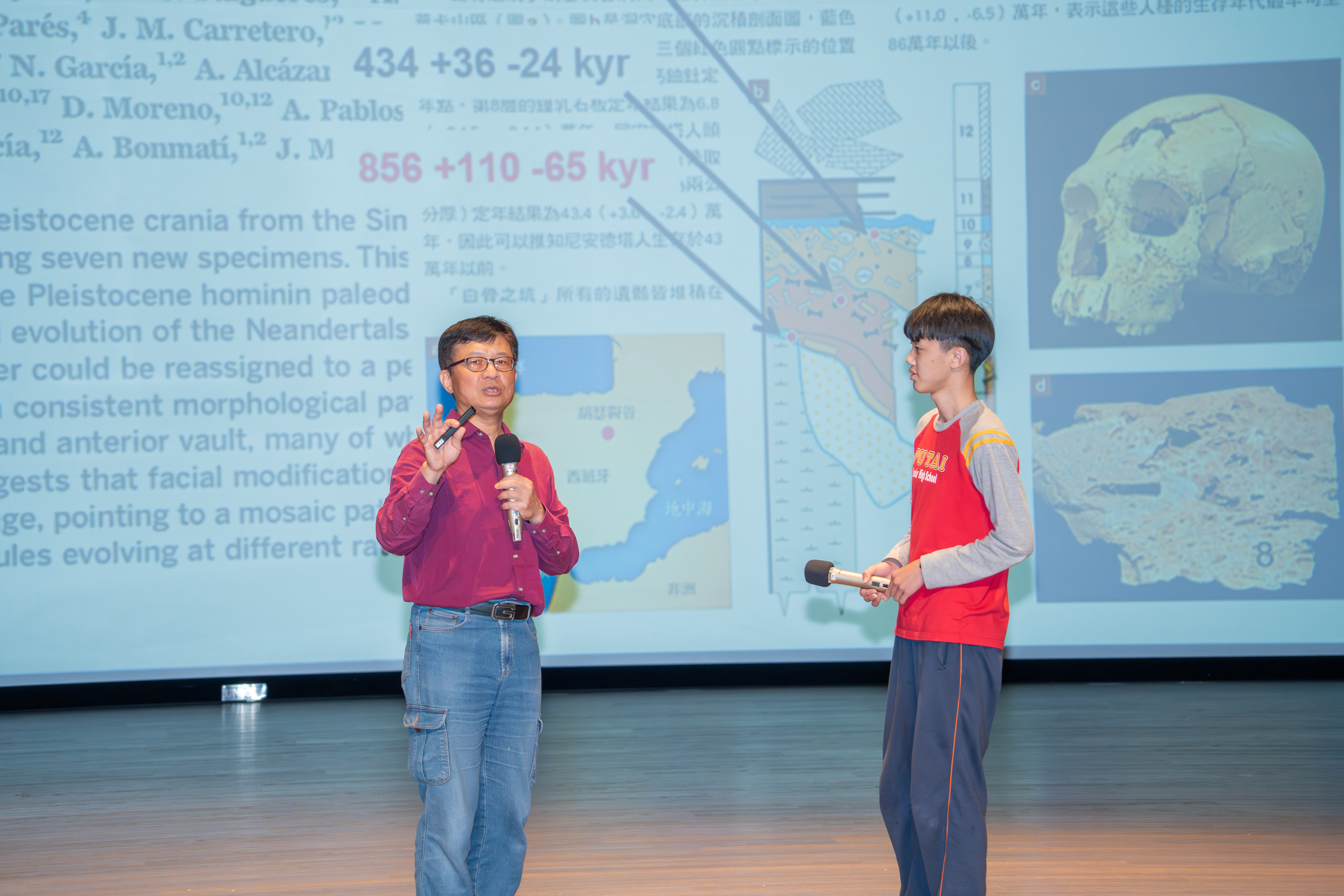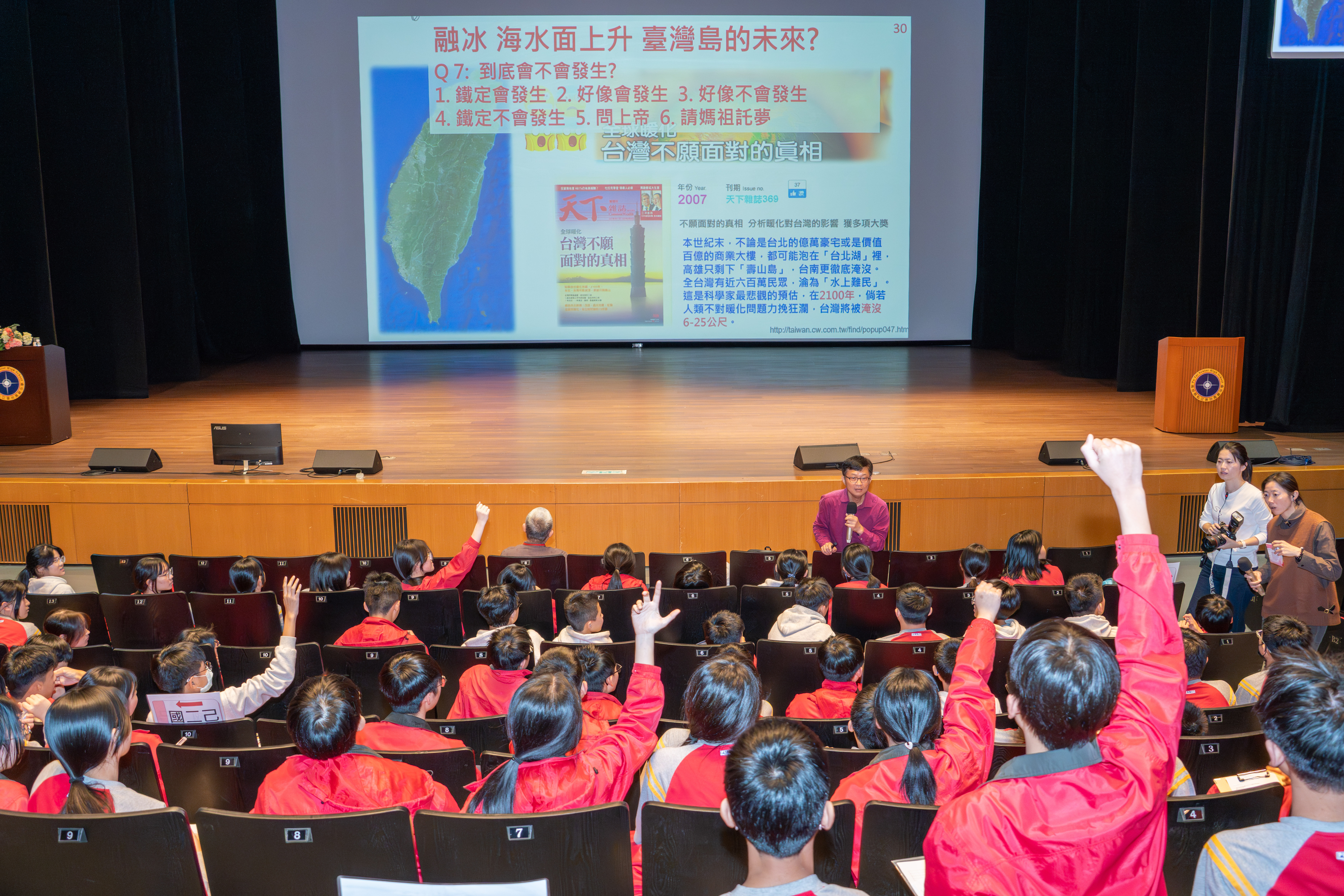 沈教授是一位名副其實的「地球探險家」,足跡遍及全球,發表多篇深具影響力的研究,包括運用「鈾釷定年技術」精準定出南太平洋珊瑚金字塔的建造年代,並測出西班牙胡瑟裂谷「尼安德塔人」的存在時間,一解人類共同祖先的身世之謎。此次講座,沈教授帶來了由他領導的國際團隊令人興奮的研究成果:有「太平洋威尼斯」之稱的南馬都爾古城遺址,在經過精密的定年分析後,發現氣候變化所導致的海平面日益上升,竟然是讓一個曾經輝煌數世紀的王朝走向滅亡的關鍵因素。藉由此項研究,沈教授指出人類文明發展與氣候變遷的密切關聯,也提醒同樣身處海島國家的我們,關注氣候變遷可能帶來的影響是大家共同的責任。沈教授強調,理解過去,才能更有智慧地面對未來,期許孩子們也能從歷史汲取教訓,培養對地球環境的關懷,持續保持好奇心與探索精神,為世界的未來創造更多美好的可能。