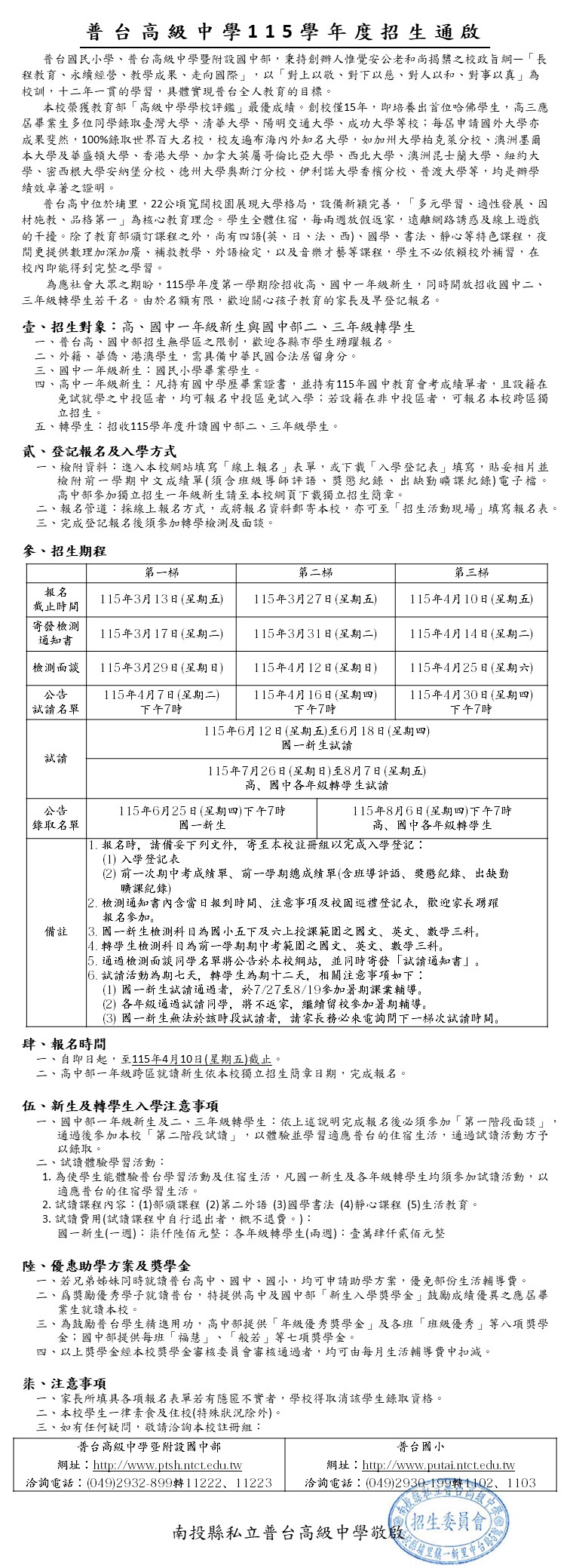普台高級中學暨附設國中部115學年度第一學期招生通啟